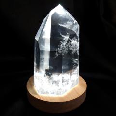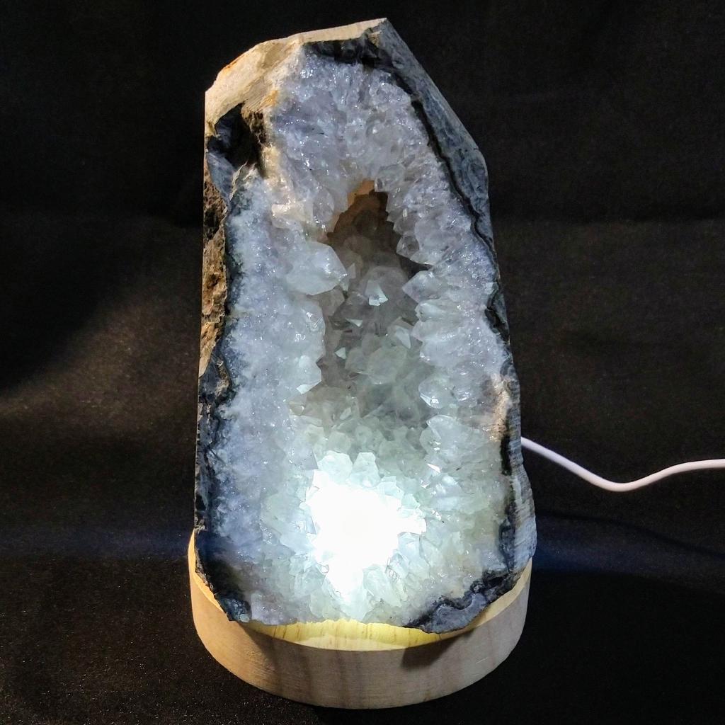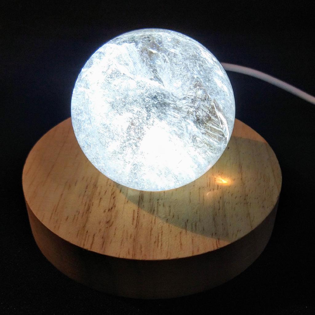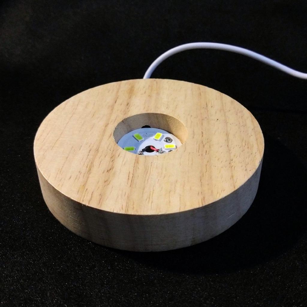Wood Lighted Display Stand. Appropriate for spheres or flat-base stones. USB cord with switch. 4 inches in diameter, with 1.25 inch diameter hole.(Specimen not included)