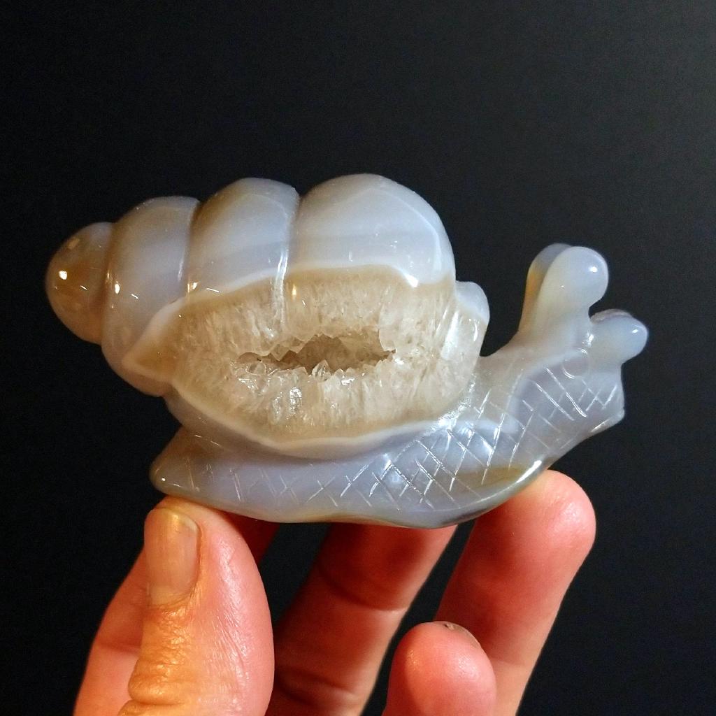 Agate Snail carving, with natural quartz cavity. 3.3 inches long, 0.29 pound in weight. This is a one-of-a-kind item - you will receive the actual item in photo. Once sold, it is gone.