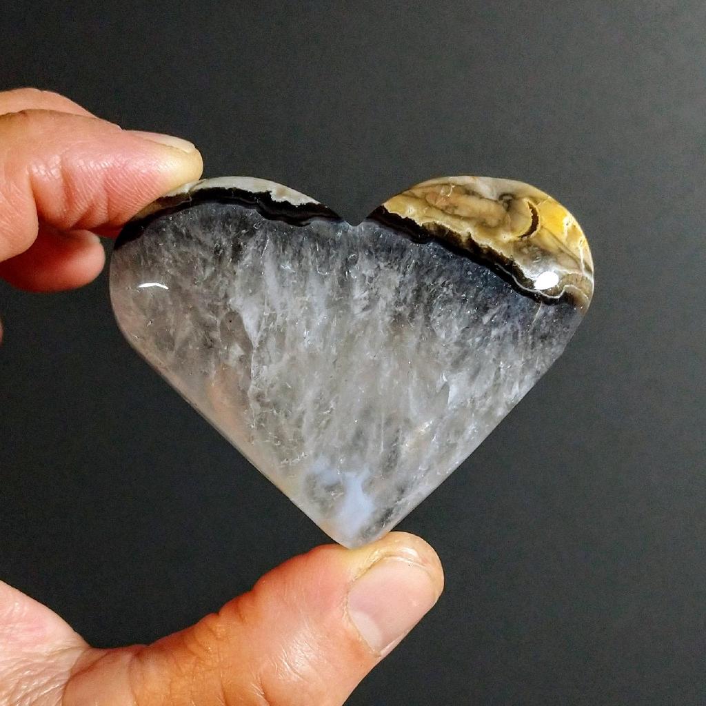 Volcano Agate Heart, with quartz. 2.65 inches wide. This is a one-of-a-kind item - you will receive the actual item in photo. Once sold, it is gone.