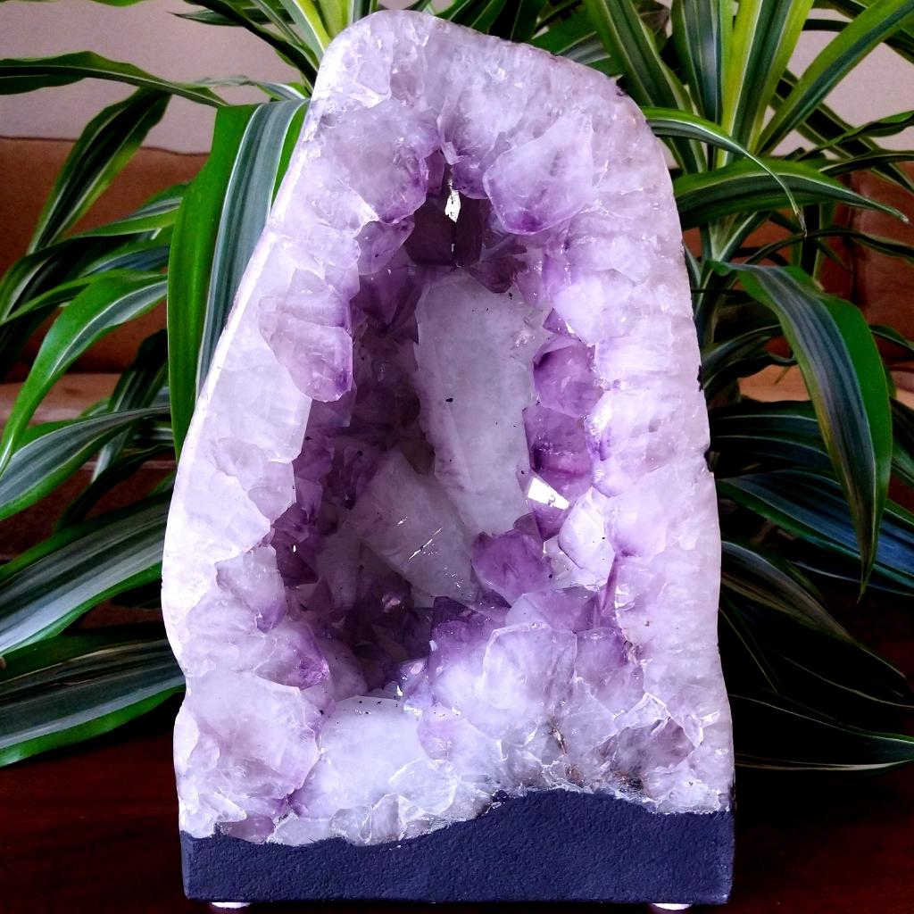 Amethyst Geode, 12 inches tall, 17.65 pounds in weight. Large crystals, with two large quartz, and geode has a full polish - light from behind illuminates the interior - either sunlight or a light will do this - see additional images. This is a one-of-a kind item - you will receive the actual item in photo - once sold, it is gone.