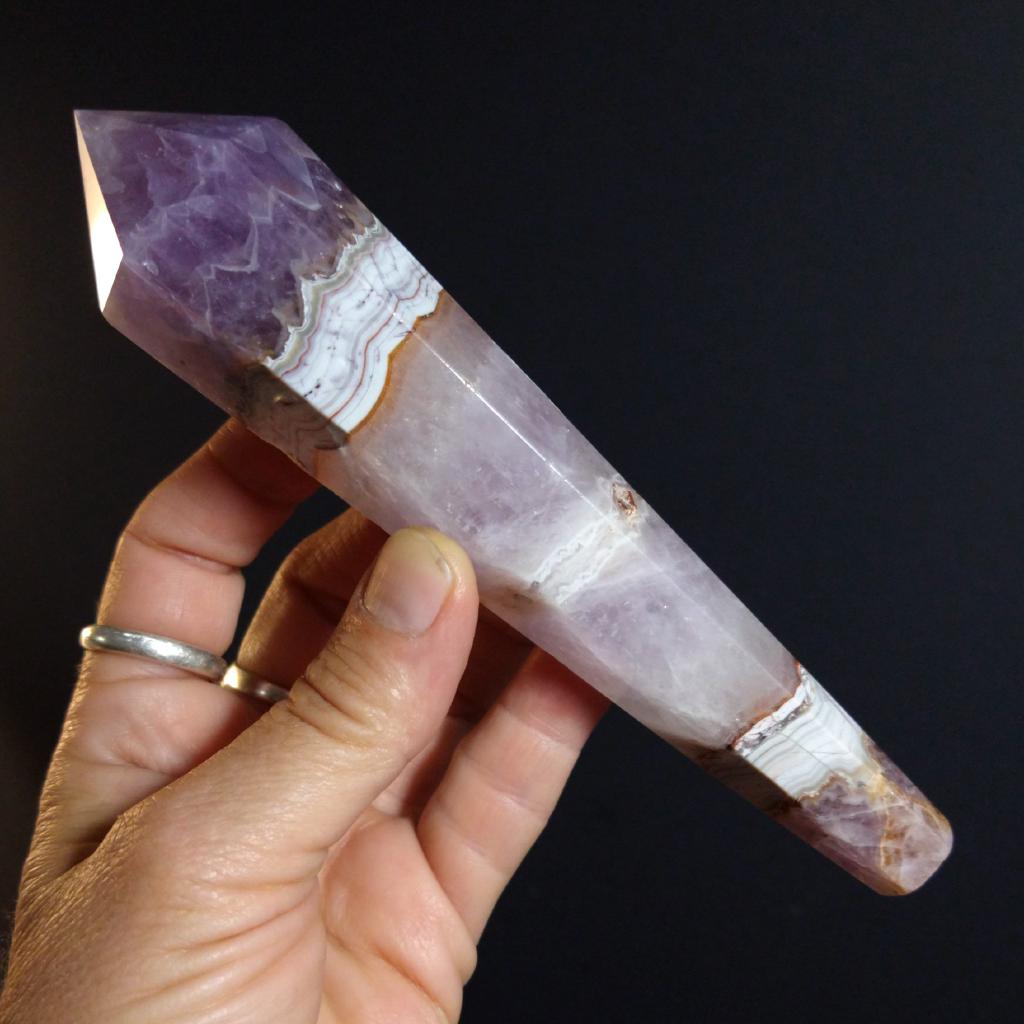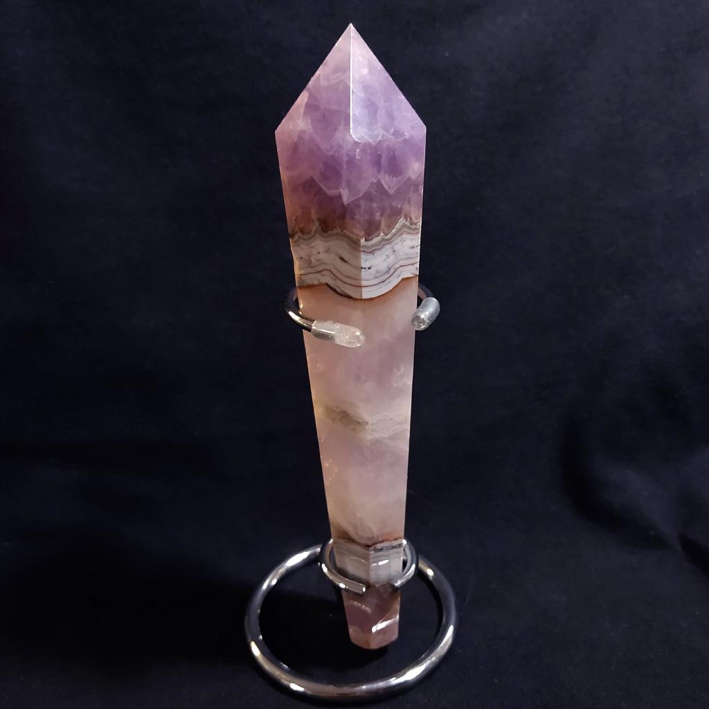 Lace Amethyst cut & polished, 6.15 inches long. Stand included - see additional image. This is a one-of-a-kind item. You will receive the actual item in photo. Once sold, it is gone.