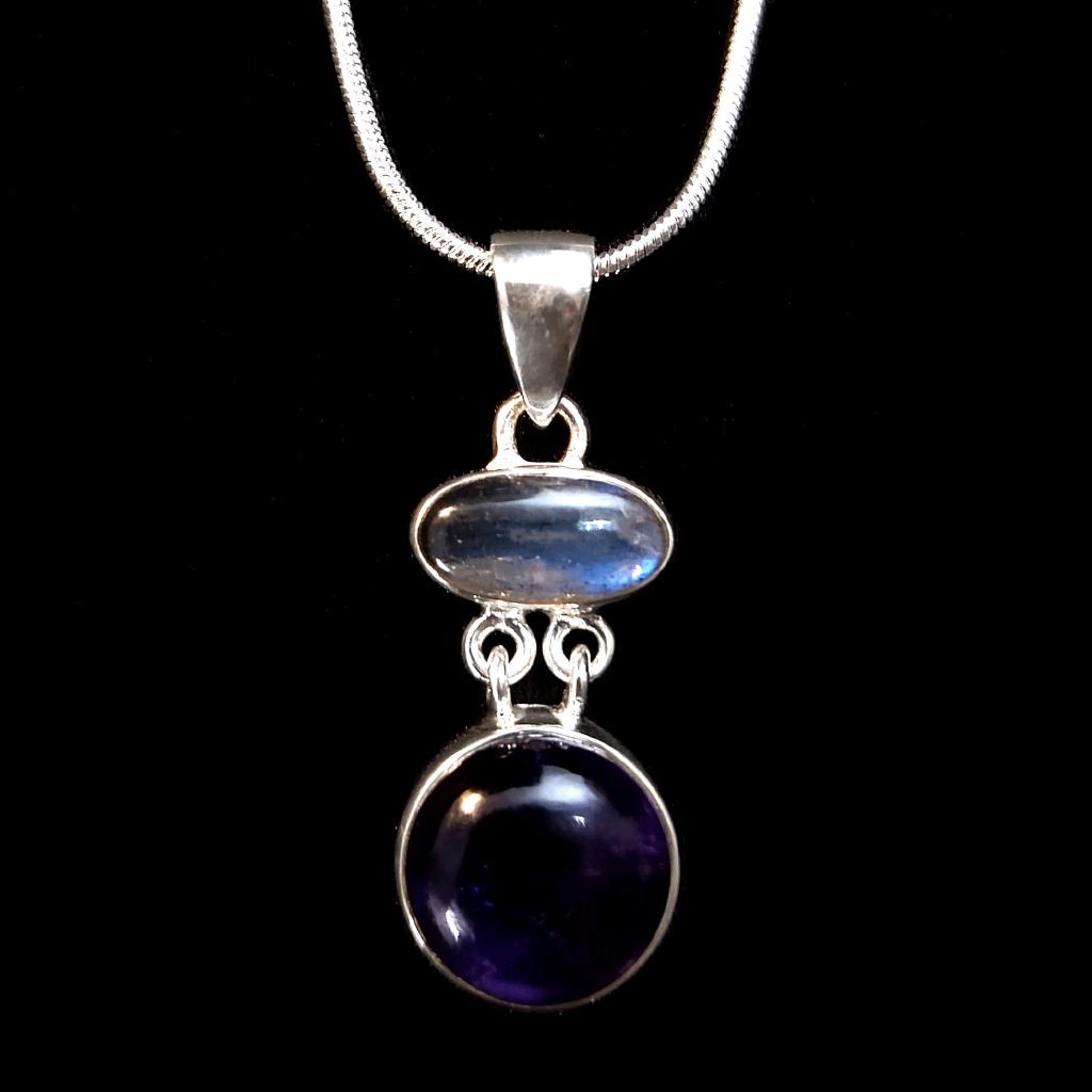 Small Spectrolite & Amethyst Pendant, set in sterling silver. 18 inch silver plate courtesy chain included. 1.5 inches long including bail. This is a one-of-a-kind item - you will receive the actual item in photo. Once sold, it is gone.
