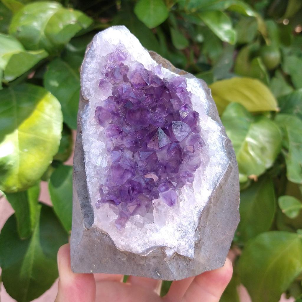 Amethyst cluster specimen, with cut base so it stands up for display. 4.25 inches tall, 1.55 pounds in weight.This is a one-of-a-kind item - you will receive the actual item in photo. Once sold, it is gone.