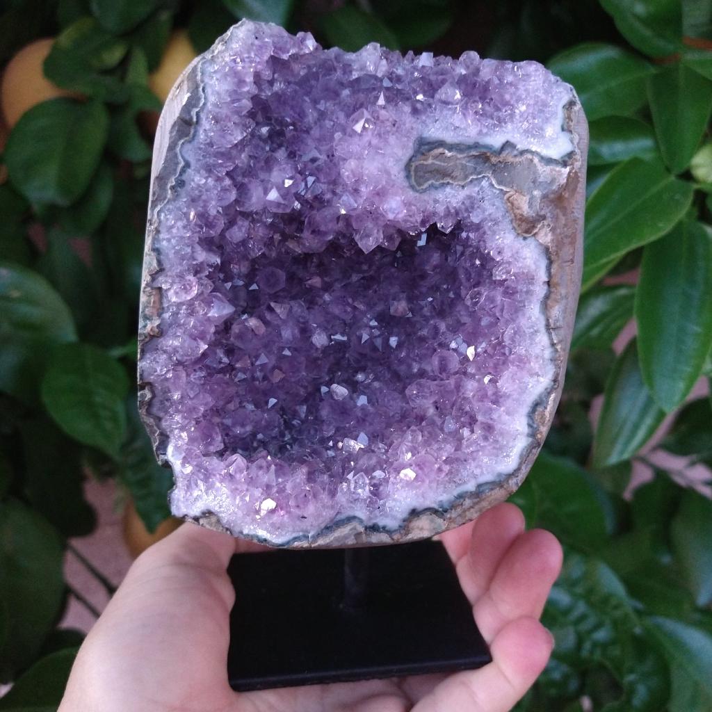 Amethyst with stand. 6 inches tall, 2.10 pounds in weight. This is a one-of-a-kind item - you will receive the actual item in photo. Once sold, it is gone.