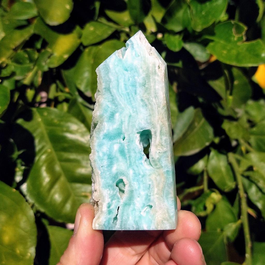 Small Blue Aragonite, cut tower. 2.25 inches long.This is a one-of-a-kind item. You will receive the actual item in photo. Once sold, it is gone.