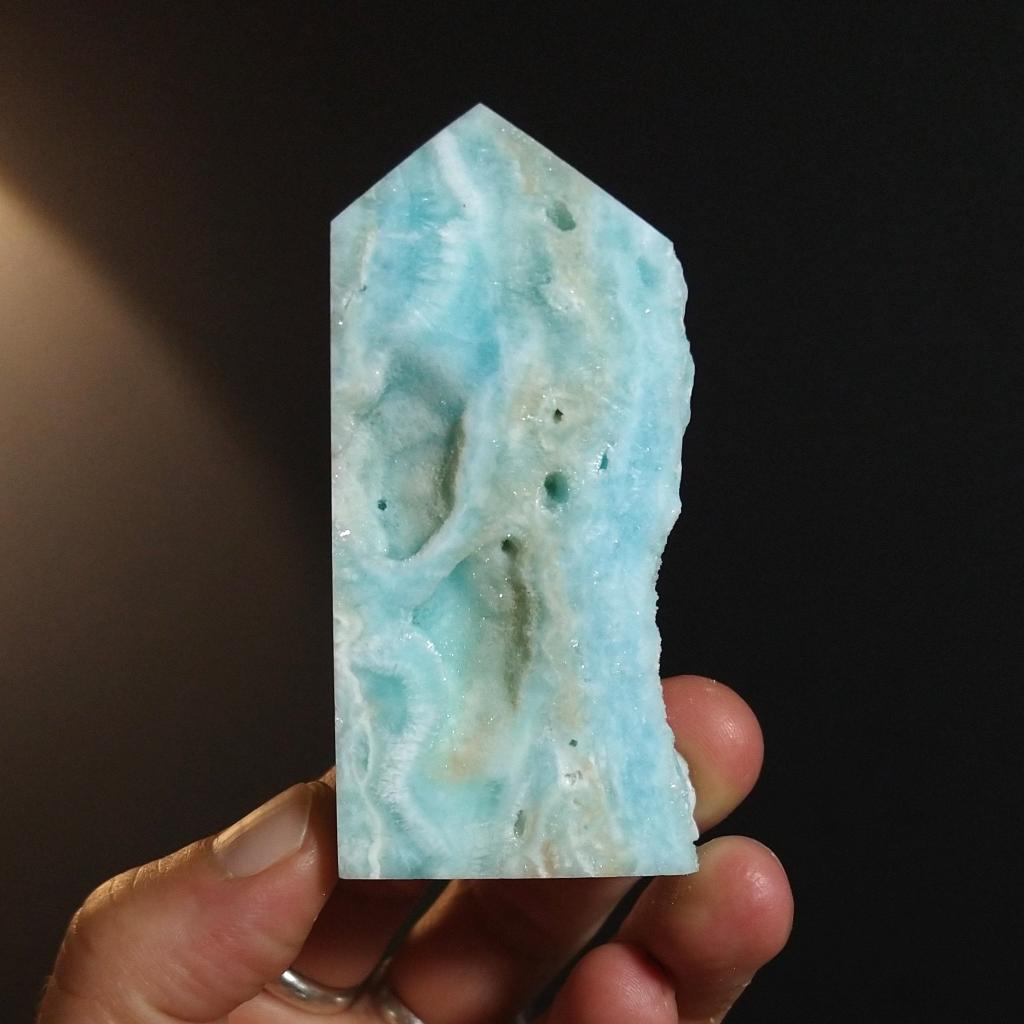 Blue Aragonite, cut tower. 3 inches long.This is a one-of-a-kind item. You will receive the actual item in photo. Once sold, it is gone.