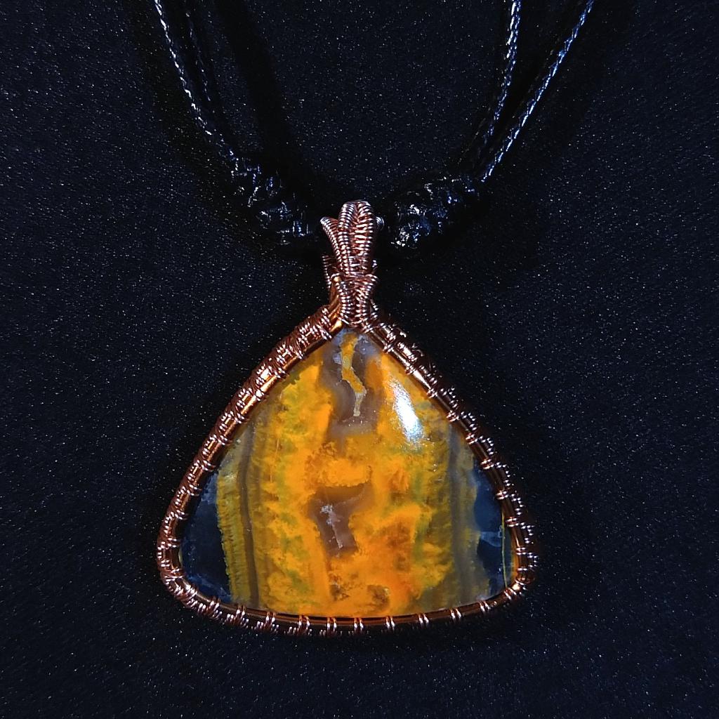 Bumblebee Jasper copper wire-wrapped pendant. On adjustable black cord. 1.8 inches long. This is a one-of-a-kind item - you will receive the actual item in photo. Once sold, it is gone.