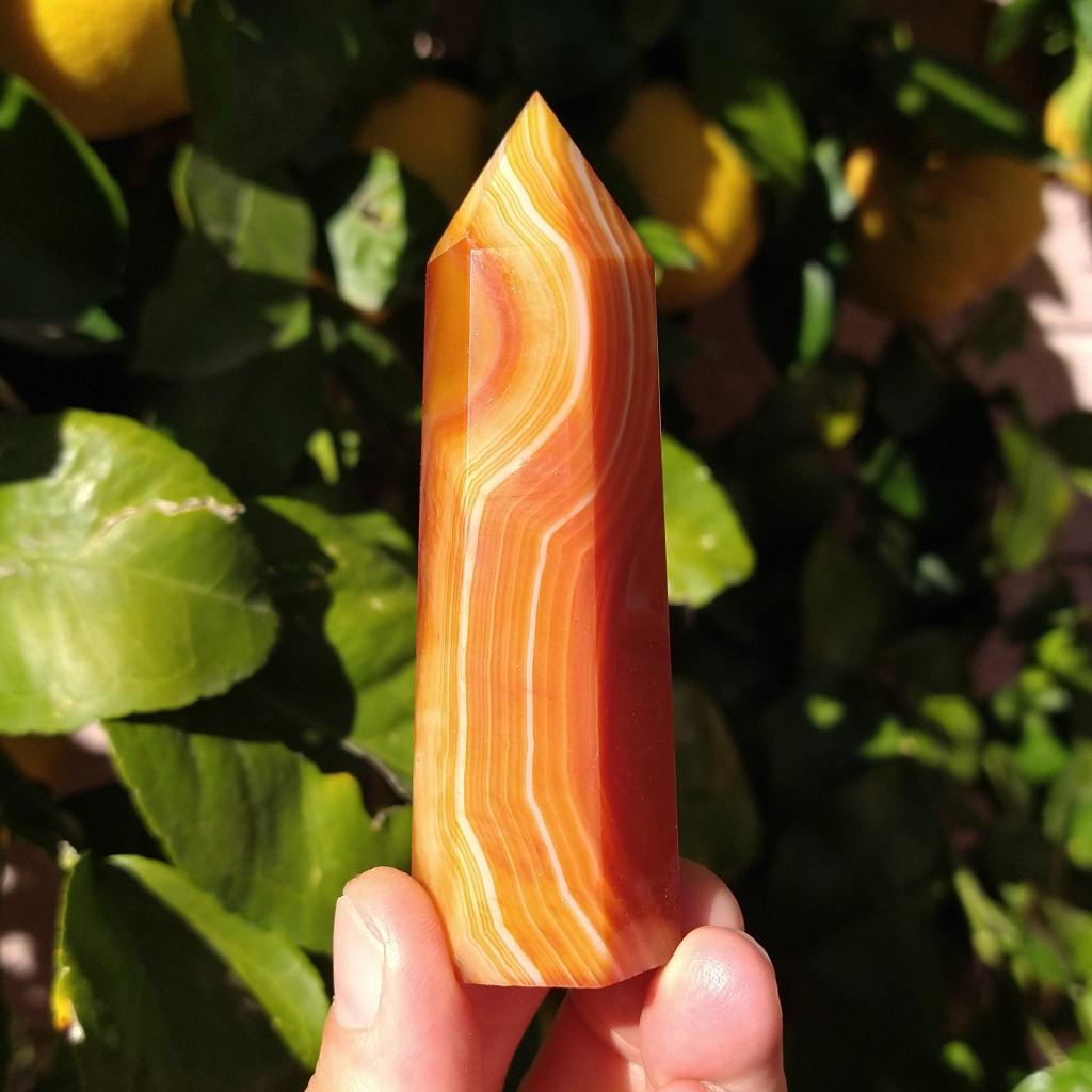 Carnelian cut & polished tower. 3.6 inches long, 0.20 pound in weight. This is a one-of-a-kind item - you will receive the actual item in photo. Once sold, it is gone.