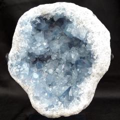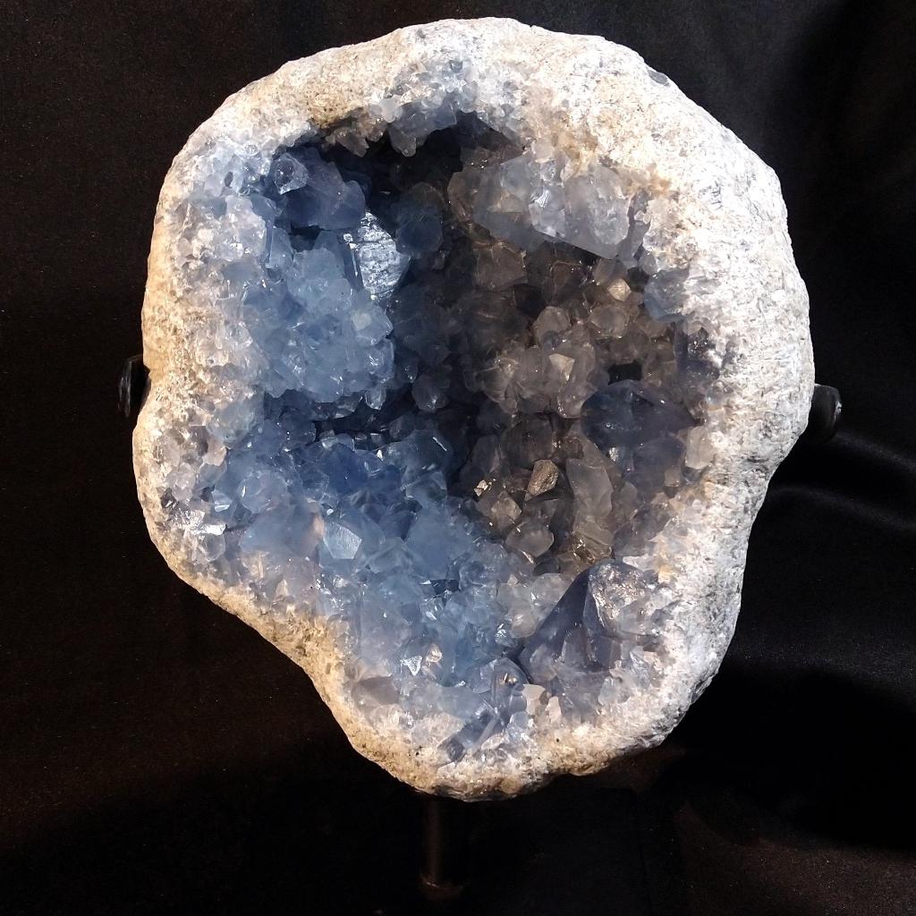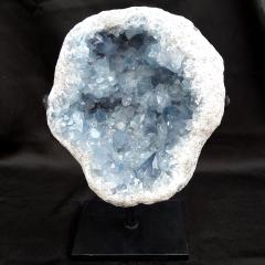 Celestite Geode from Madagascar with custom wrought-iron stand.Geode is 8.8 inches long, total height with stand is 11.75 inches. Total weight including stand is 15.38 pounds.This is a one-of-a-kind item - you will receive the actual item in phot. Once sold, it is gone.