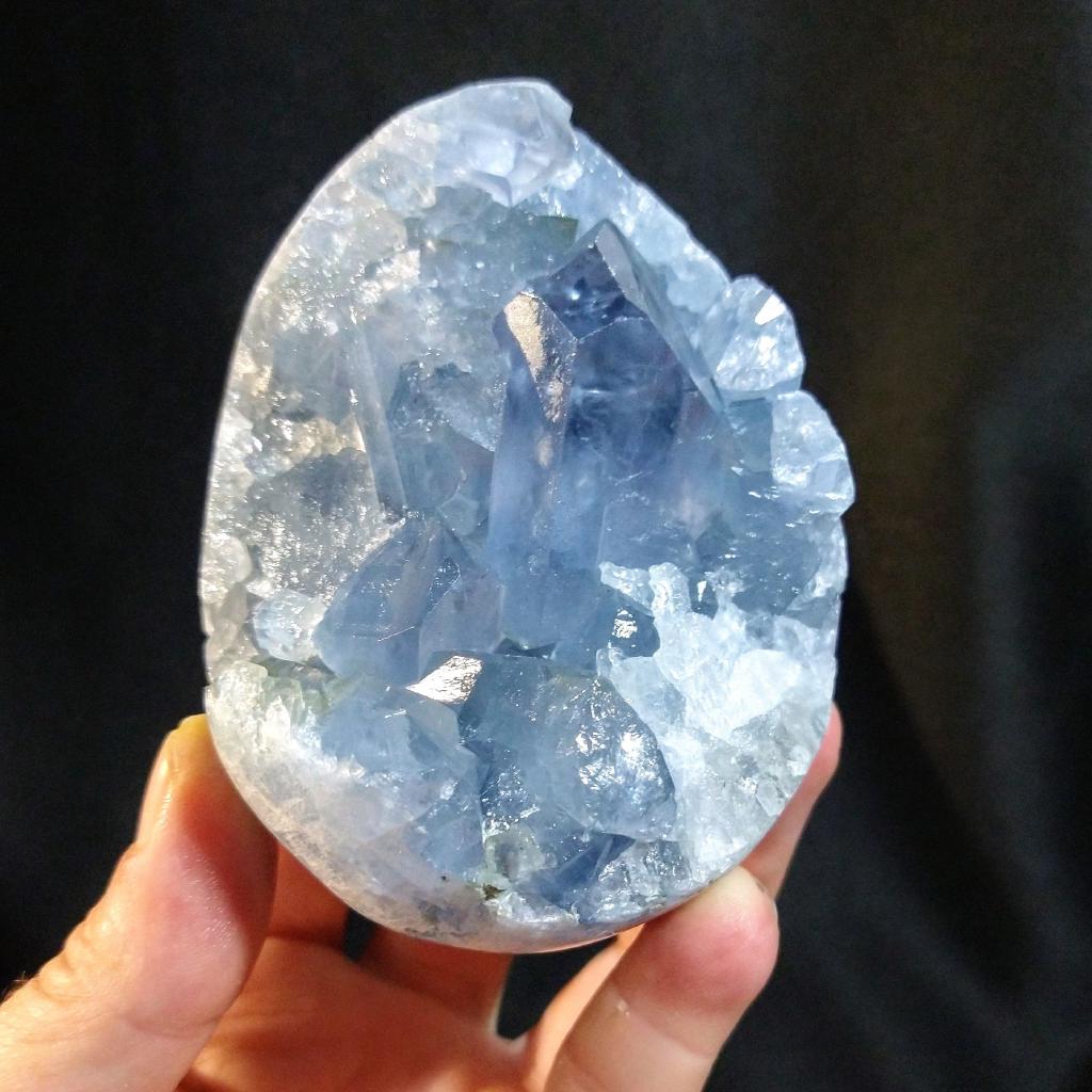 Celestite from Madagascar. 3.75 inches long, 1.25 pounds in weight.This is a one-of-a-kind item - you will receive the actual item in photo. Once sold, it is gone.