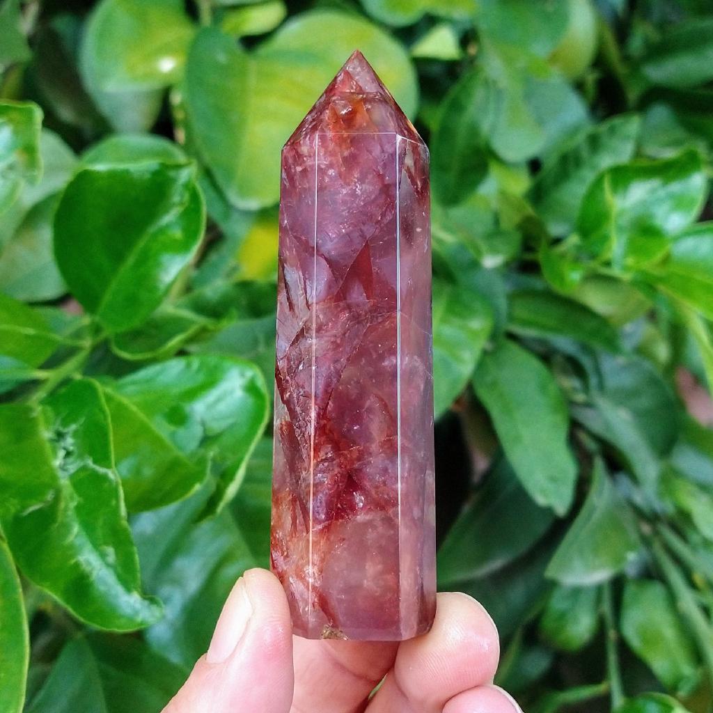 Small Fire Quartz cut & polished tower (hematoid quartz). 3.5 inches long. Deep red color.This is a one-of-a-kind item. You will receive the actual item in photo. Once sold, it is gone.