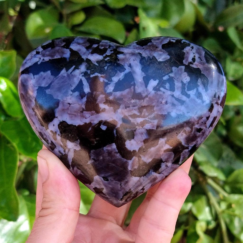 Indigo Gabbro Heart, 4 inches wide, 0.87 pound in weight. This is a one-of-a-kind item - you will receive the actual item in photo. Once sold, it is gone.