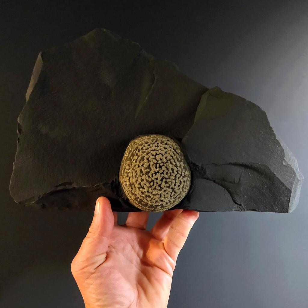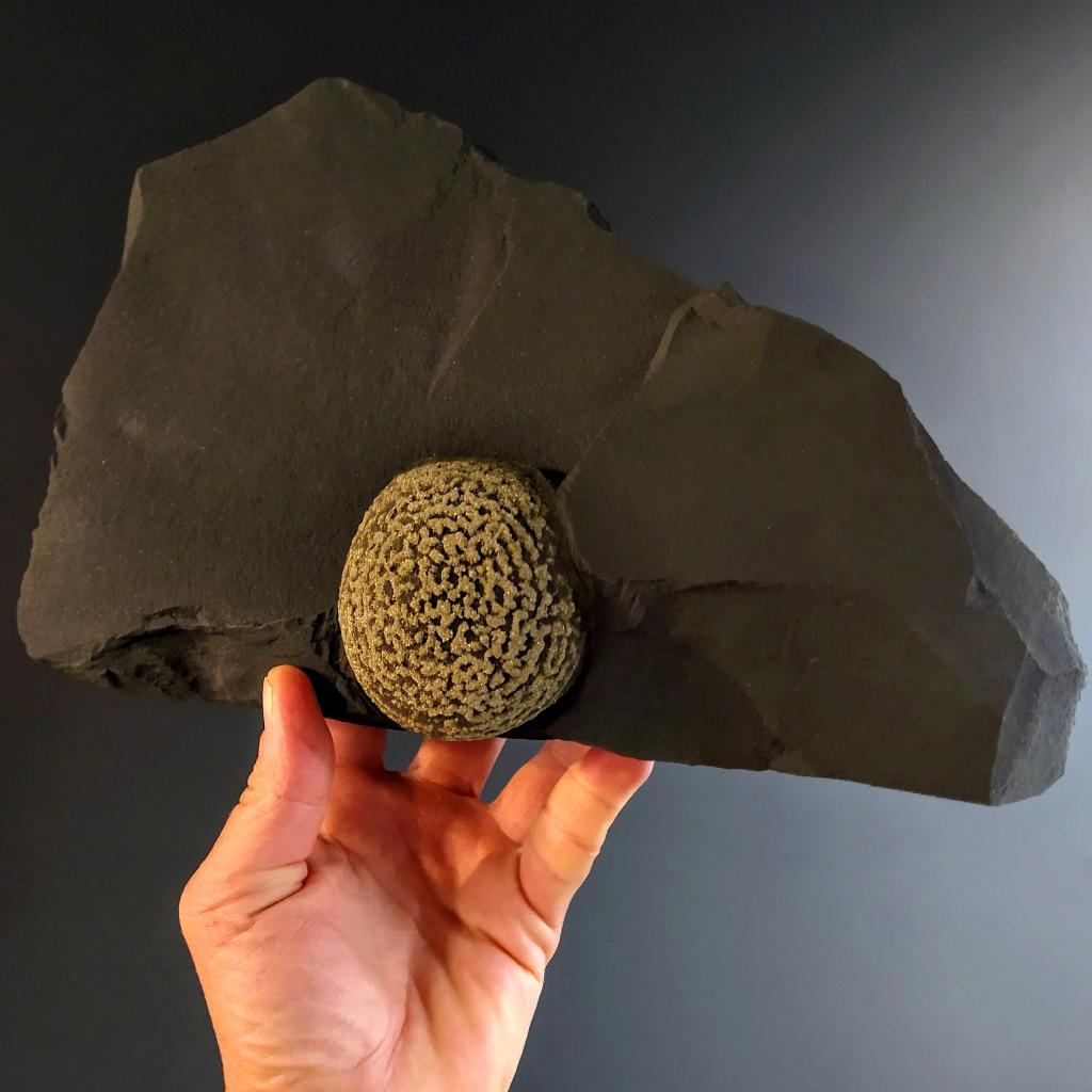 Orbicular Iron Pyrite Concretion specimen, in shale matrix. From Yunnan Province, China. total length of specimen is 9.25 inches long, pyrite concretion is 2.25 inches long. 4.4 pounds in weight.Exhibits nicely formed concentric circles of pyrite.This is a one-of-a-kind item - you will receive the actual item in photo. Once sold, it is gone.