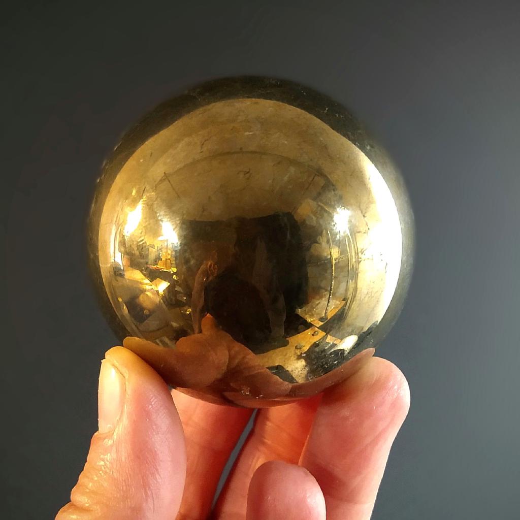 Iron Pyrite Sphere. 2.25 inches in diameter, 1.03 pounds in weight. This is a one-of-a-kind item - you will receive the actual item in photo. Once sold, it is gone.