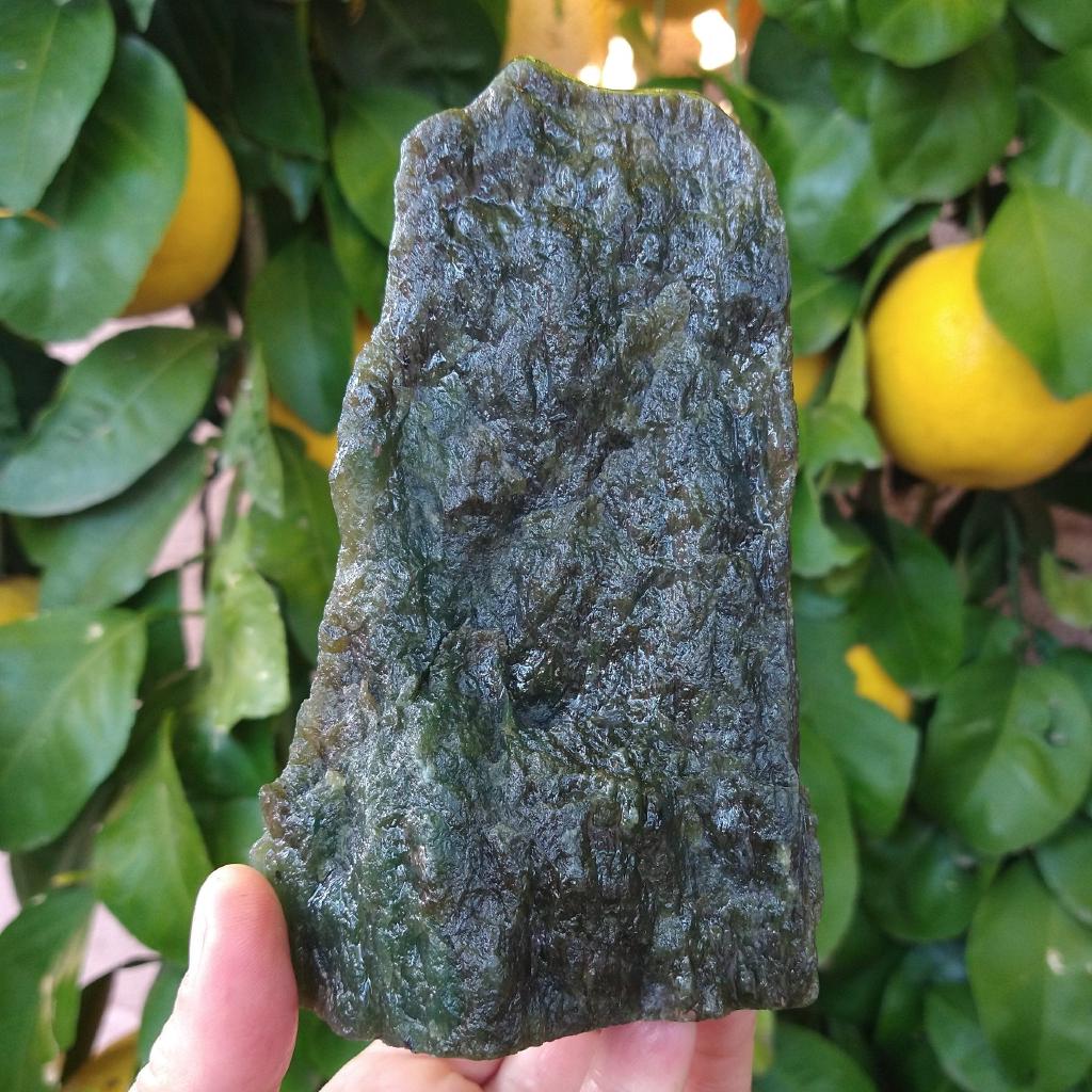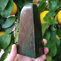 Nephrite Jade, free-form cut and polished on one side, rough on the other side - see additional image. 5 inches long, 1.38 pound in weight.This is a one-of-a kind item - you will receive the actual item in photo - once sold, it is gone.