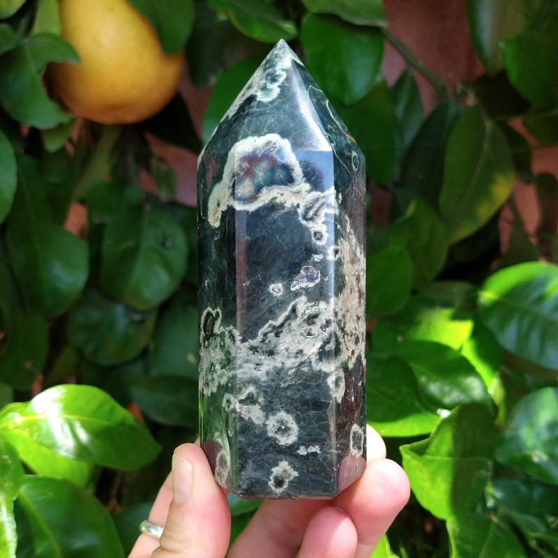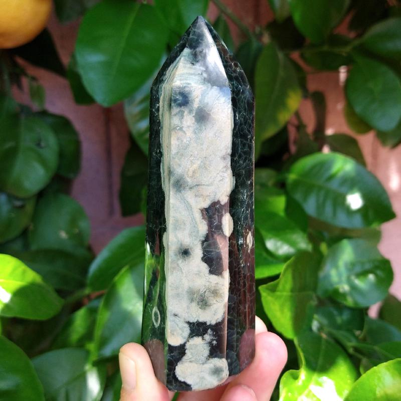 Kambaba Jasper cut & polished Tower. 9 inches tall, 5.43 pounds in weight. This is a one-of-a-kind item - you will receive the actual item in photo. Once sold, it is gone.