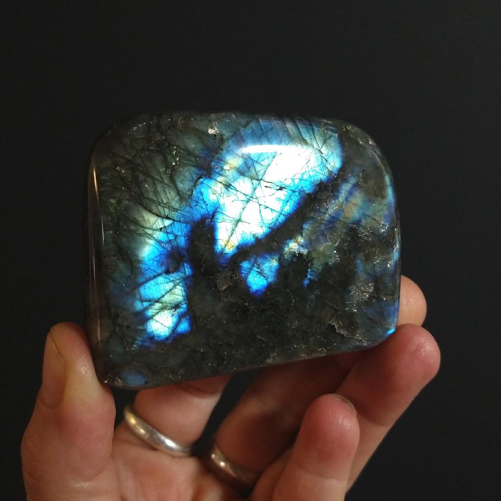Polished Labradorite from Madagascar. 2.8 inches long, 0.45 pound in weight. This is a one-of-a-kind item. You will receive the actual item in photo. Once sold, it is gone.