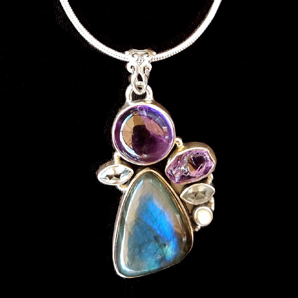 Labradorite with Amethyst, Aquamarine, and Pearl Pendant, set in sterling silver. 1.5 inches long, including bail.18 inch silver plate courtesy chain included.This is a one-of-a-kind item - you will receive the actual item in photo. Once sold, it is gone.