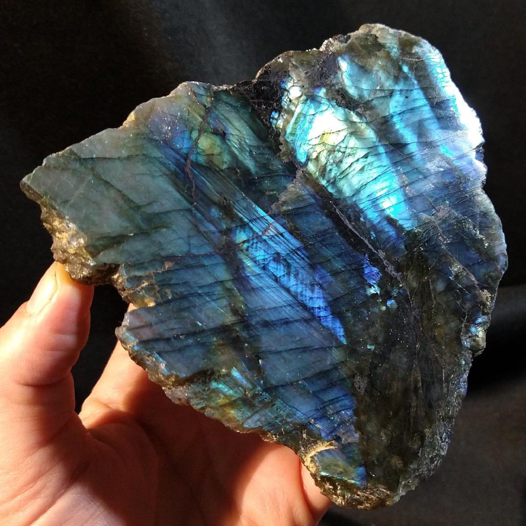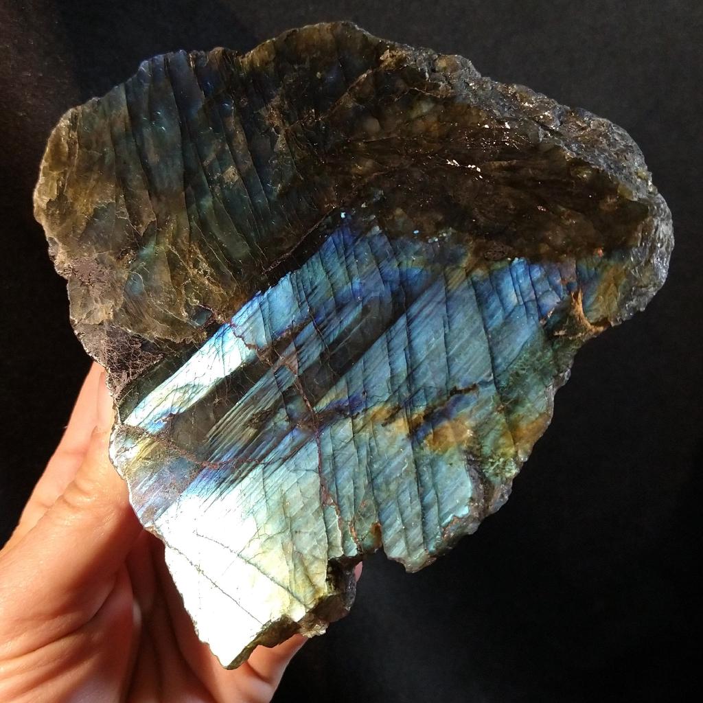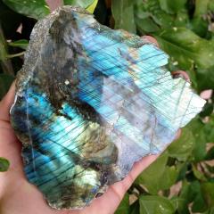 Labradorite from Madagascar. Polished on one side. 5 inches long, 0.85 pound in weight.This is a one-of-a-kind item. You will receive the actual item in photo. Once sold, it is gone.