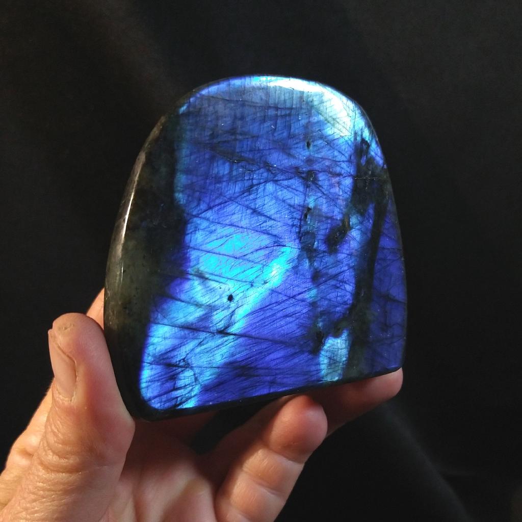 Polished Labradorite from Madagascar. 2.85 inches long, 0.40 pound in weight.This is a one-of-a-kind item. You will receive the actual item in photo. Once sold, it is gone.