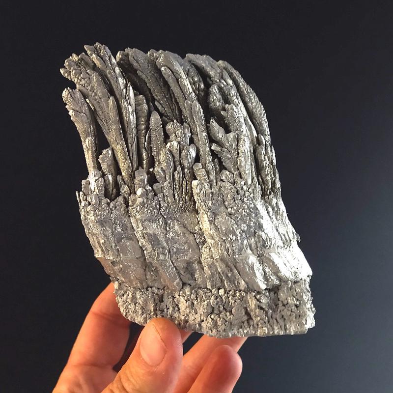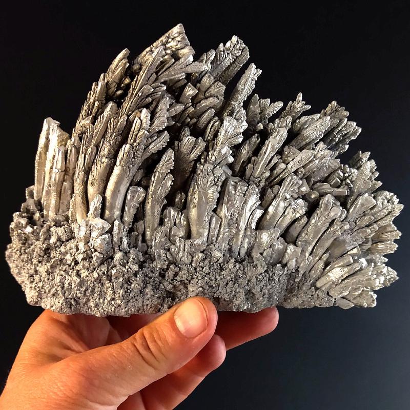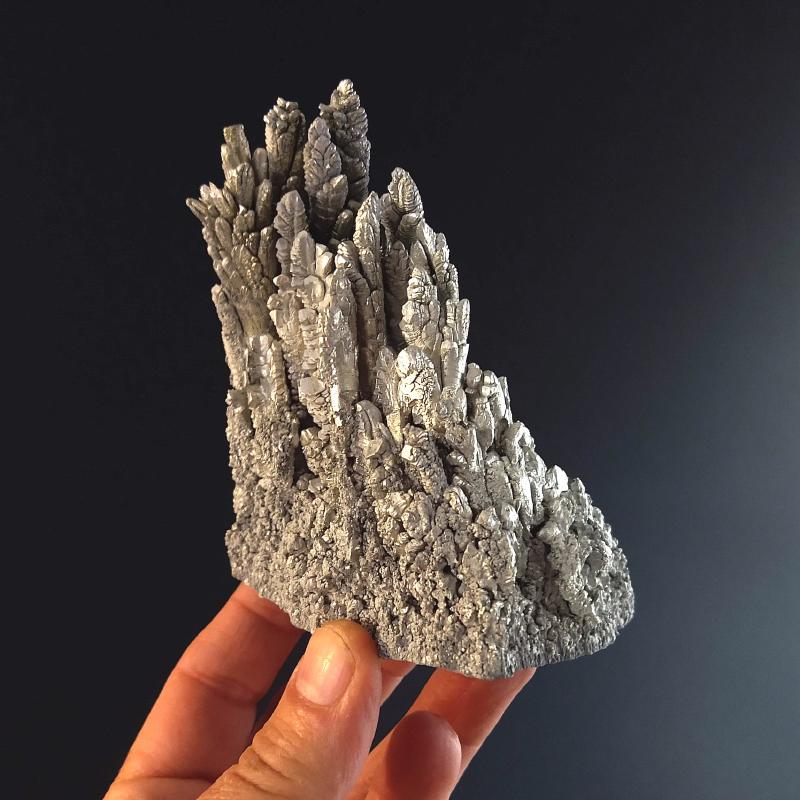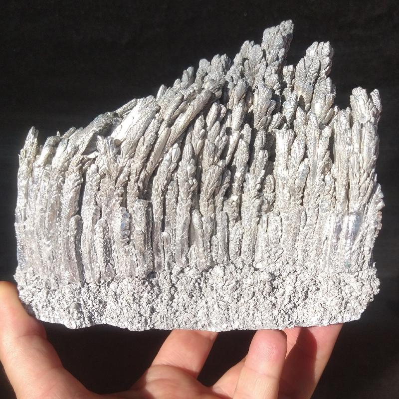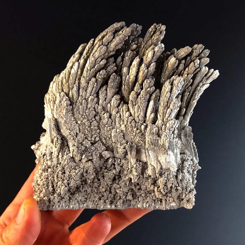 Laboratory Grown Elemental Magnesium. This specimen is 5.5 inches long and weighs 0.66 pounds. This specimen exhibits a beautiful, feathery texture. This is a one-of-a-kind specimen - you will receive the actual item in photo. Once sold, it is gone. Magnesium is an metallic element that is element number 12 in the period table of the elements. It is an essential mineral in human metabolism. This is pure Magnesium, grown in the laboratory.