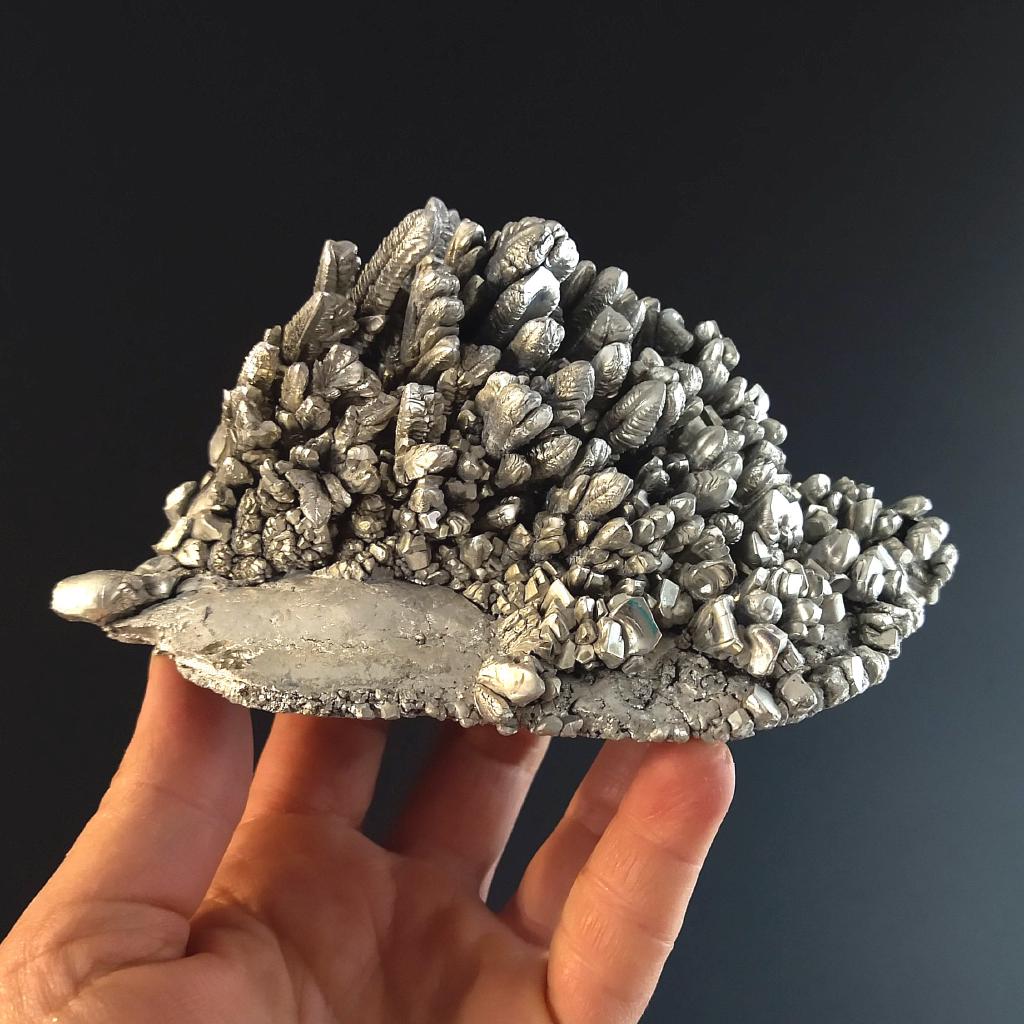 Laboratory Grown Elemental Magnesium. This specimen is 5.5 inches long and weighs 0.66 pounds. This specimen exhibits a beautiful, feathery texture. This is a one-of-a-kind specimen - you will receive the actual item in photo. Once sold, it is gone. Magnesium is an metallic element that is element number 12 in the period table of the elements. It is an essential mineral in human metabolism. This is pure Magnesium, grown in the laboratory.