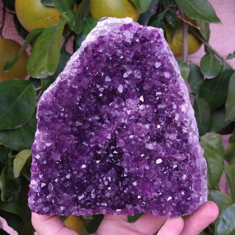 Amethyst specimen. Base cut flat for display. 6 inches wide, 4.5 inches tall, 3.77 pounds in weight. This is a one-of-a kind item - you will receive the actual item in photo - once sold, it is gone.
