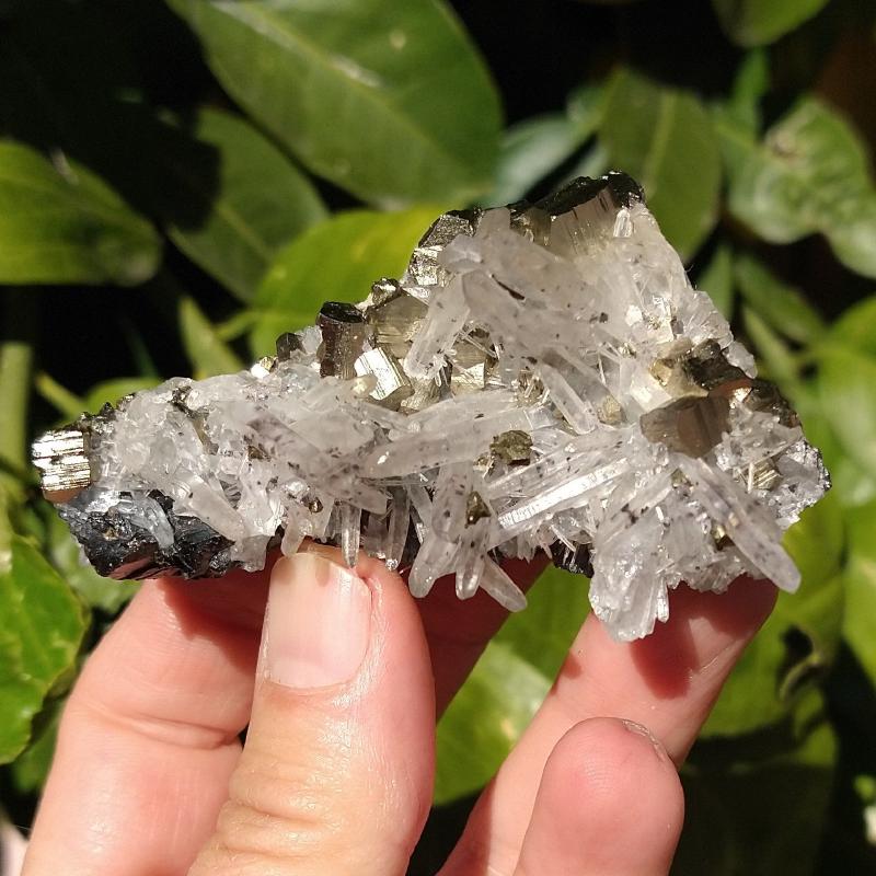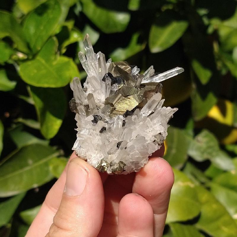 Small Quartz Cluster with Pyrite from Peru. 1.75 inches long. This is a one-of-a kind item - you will receive the actual item in photo - once sold, it is gone.