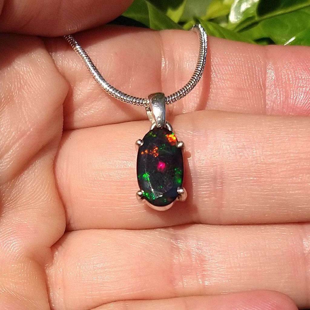 Ethiopian Black Opal Pendant. Fire seen best in natural sunlight. Set in sterling silver. 18 inch silver plate courtesy chain included. This is a one-of-a kind item - you will receive the actual item in photo - once sold, it is gone.