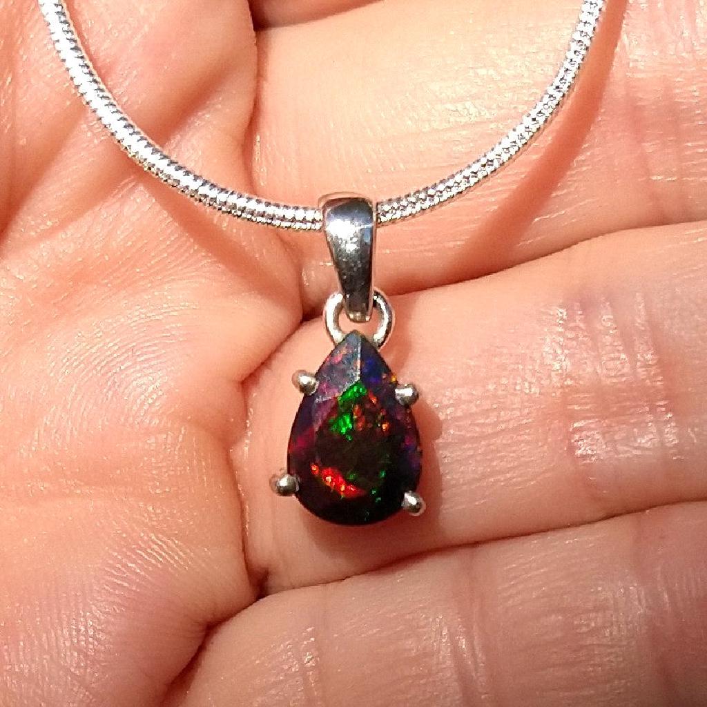 Ethiopian Black Opal Pendant. Fire seen best in natural sunlight. Set in sterling silver. 18 inch silver plate courtesy chain included. This is a one-of-a kind item - you will receive the actual item in photo - once sold, it is gone.
