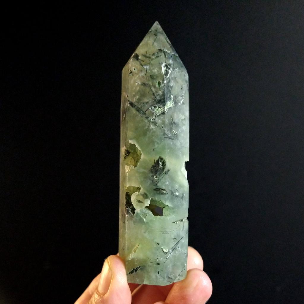 Epidote in Prehnite Tower, with natural cavities. 4 inches long, 0.28 pound in weight. This is a one-of-a-kind item. You will receive the actual item in photo. Once sold, it is gone.