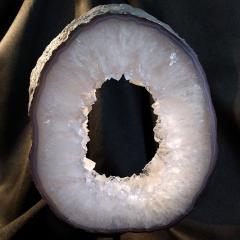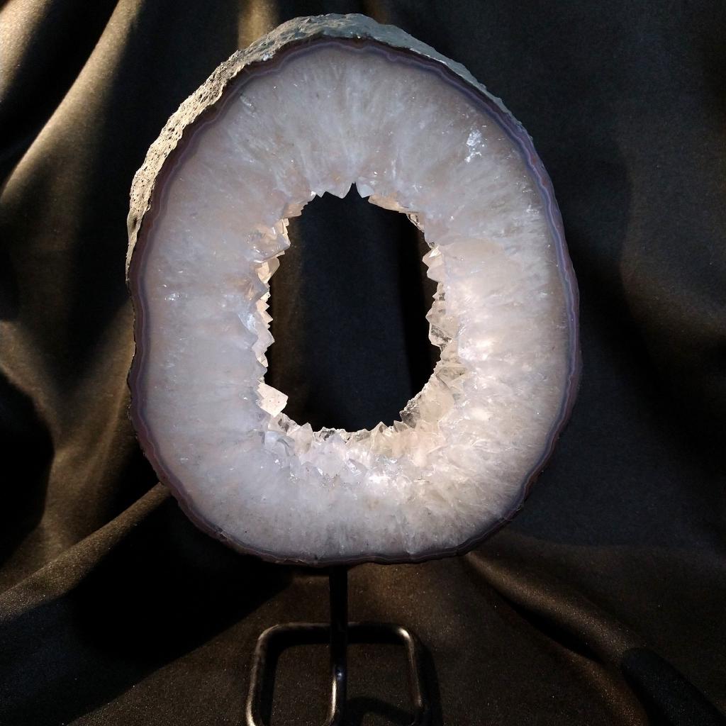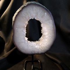 Quartz Geode Ring on Stand. 11 inches tall including stand. 5.88 pounds in weight.This is a one-of-a kind item - you will receive the actual item in photo - once sold, it is gone.