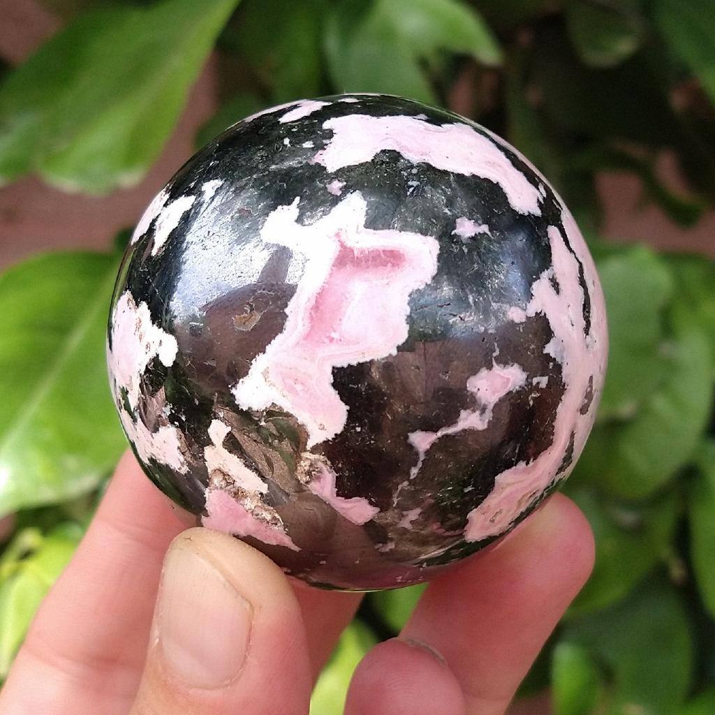 Rhodonite Sphere with Pyrite from Peru. 2.25 inches in diameter. 0.68 pound in weight.This is a one-of-a-kind item - you will receive the actual item in photo. Once sold, it is gone.