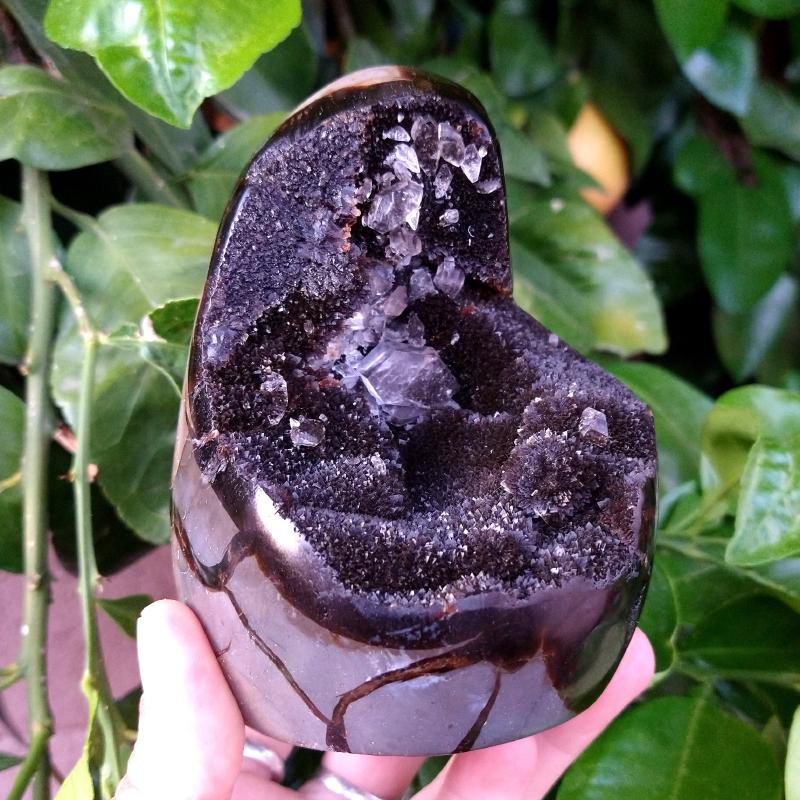 Septarians formed between 50 to 70 million years ago. As a result of volcanic eruptions, dead sea life was chemically attracted to the sediment around them, forming mud balls. As the ocean receded, the balls dried and cracked. Due to their bentonite content they also shrank in size, creating the cracks inside. As decomposed shells seeped down into the cracks in the mud balls, calcite crystals formed. The outer thin walls of calcite then transformed into aragonite. The name Septarian comes from the Latin word “septem”, meaning seven, because the mud balls had a tendency to crack in 7 points in every direction, thereby creating the distinctive pattern these nodules exhibit.
