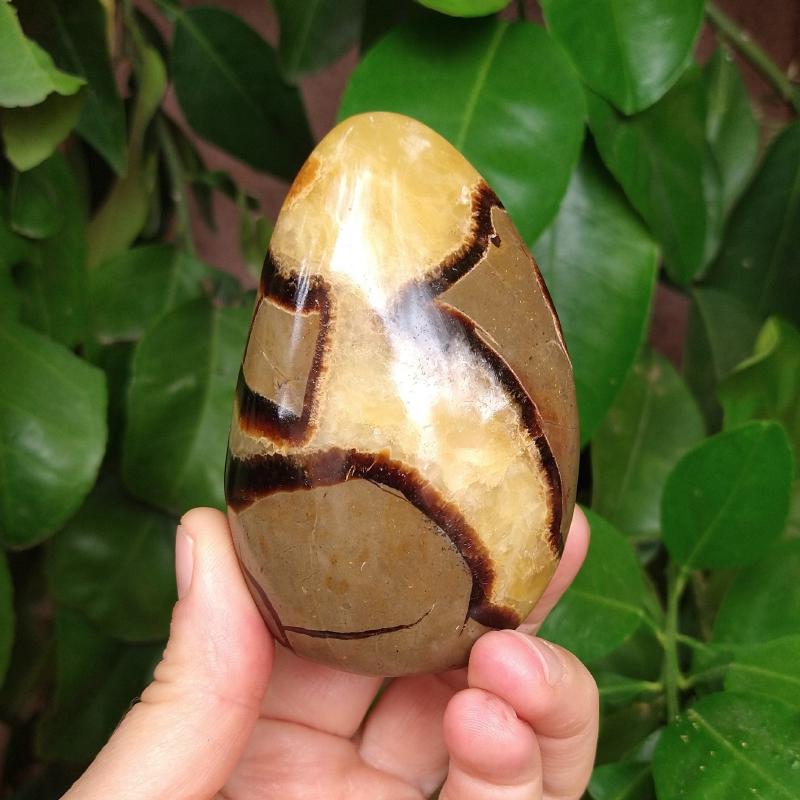 Septarians formed between 50 to 70 million years ago. As a result of volcanic eruptions, dead sea life was chemically attracted to the sediment around them, forming mud balls. As the ocean receded, the balls dried and cracked. Due to their bentonite content they also shrank in size, creating the cracks inside. As decomposed shells seeped down into the cracks in the mud balls, calcite crystals formed. The outer thin walls of calcite then transformed into aragonite. The name Septarian comes from the Latin word “septem”, meaning seven, because the mud balls had a tendency to crack in 7 points in every direction, thereby creating the distinctive pattern these nodules exhibit.