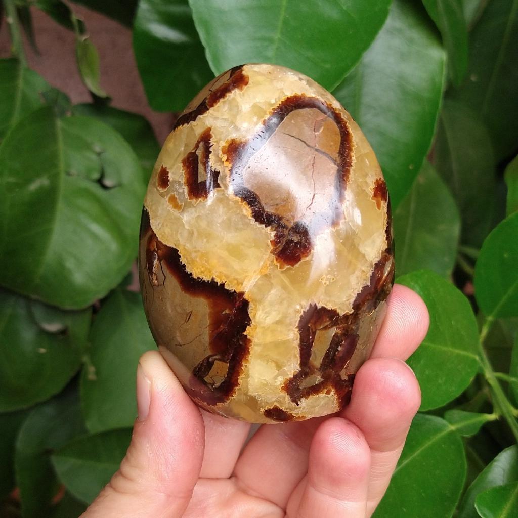 Septarian, cut & polished, from Madagascar. 2.85 inches long, 0.42 pound in weight. This is a one-of-a-kind item - you will receive the actual item in photo. Once sold, it is gone.