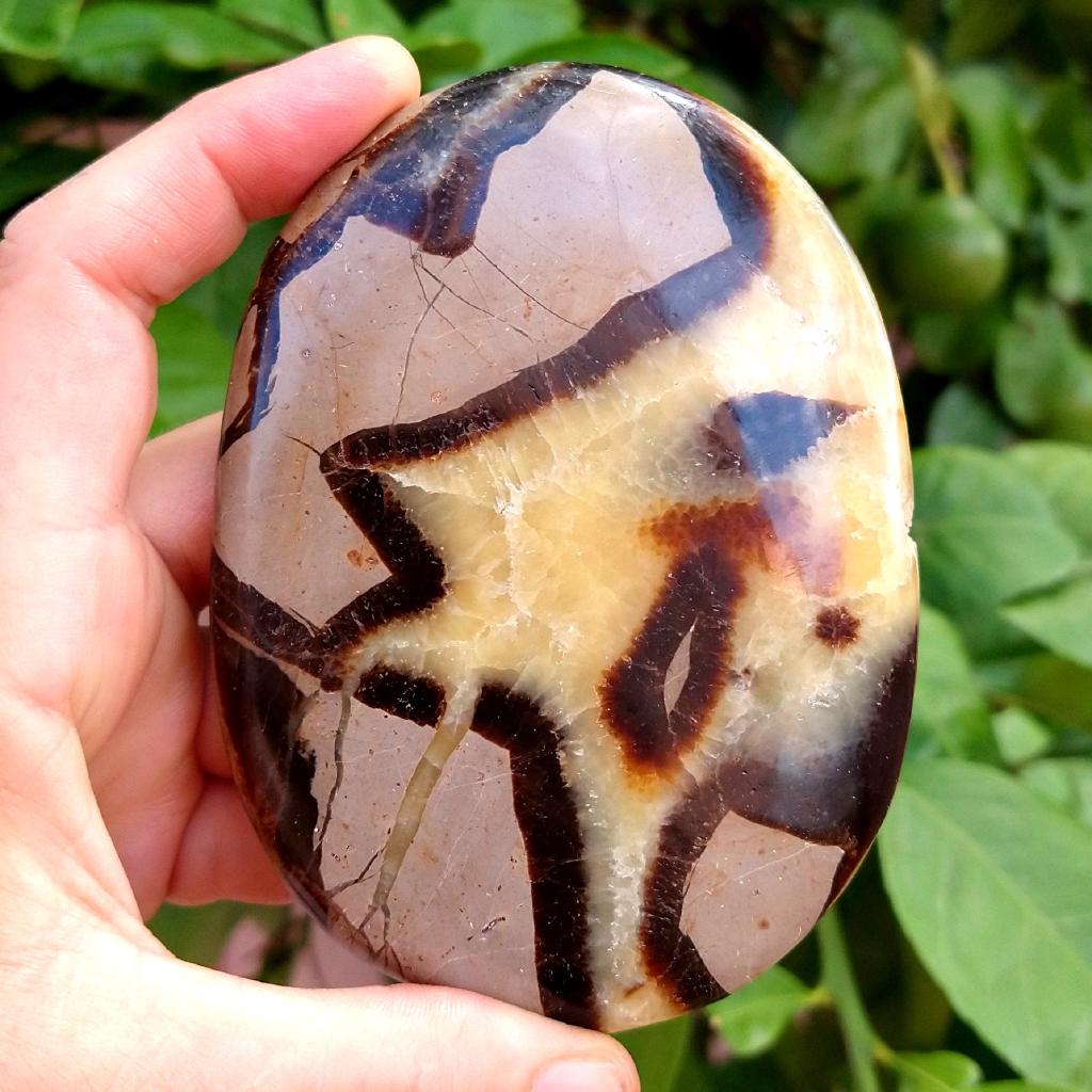 Polished Septarian nodule, from Madagascar. 4.25 inches long, 0.54 pound in weight.This is a one-of-a-kind item - you will receive the actual item in photo. Once sold, it is gone.