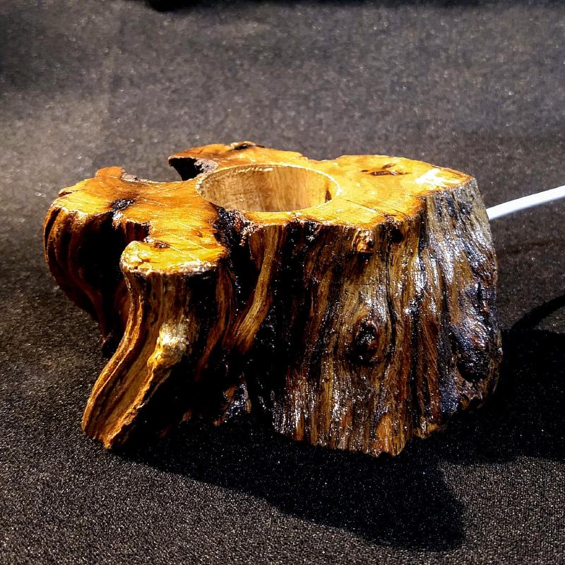 Wood Lighted Display Stand. Appropriate for spheres or flat-base stones. USB cord with switch. Approximately 3.5 - 4 inches in size. Each one unique. Made of natural wood. Hole diameter is 1.25 inches.(Specimen not included)