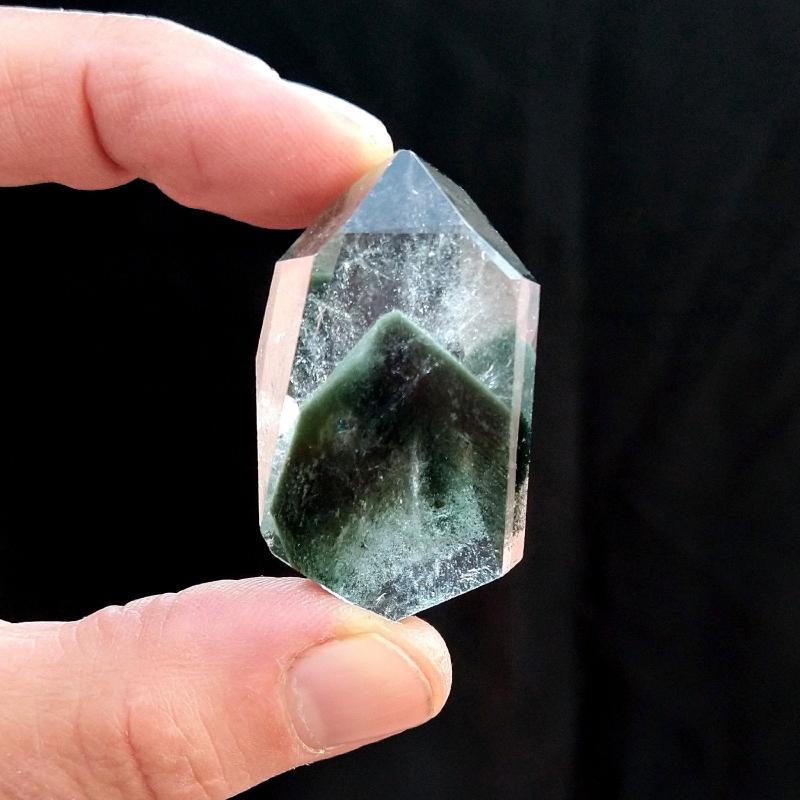 Green Chlorite Phantom Lodolite Quartz. Cut & polished, 2 inches long. This is a one-of-a kind item - you will receive the actual item in photo - once sold, it is gone.