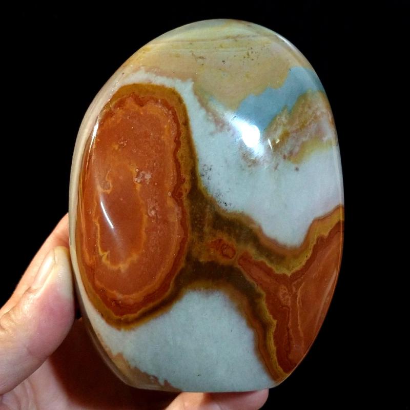 Polychrome Jasper cut & polished, from Madagascar. 4.25 inches tall, 1.48 pounds in weight. This is a one-of-a kind item - you will receive the actual item in photo - once sold, it is gone.