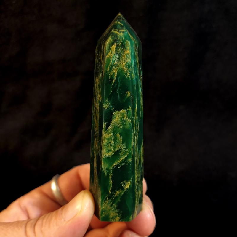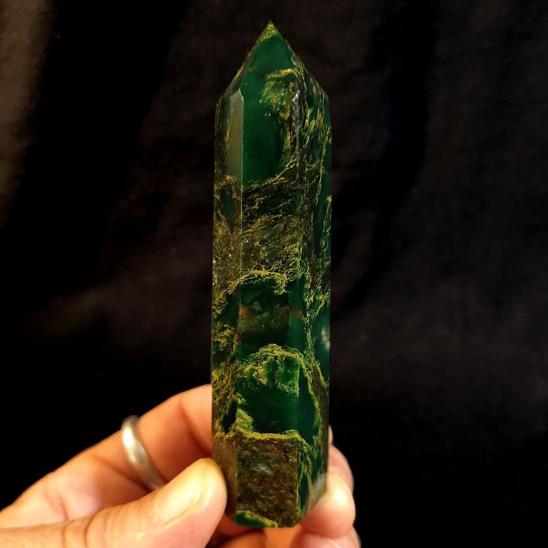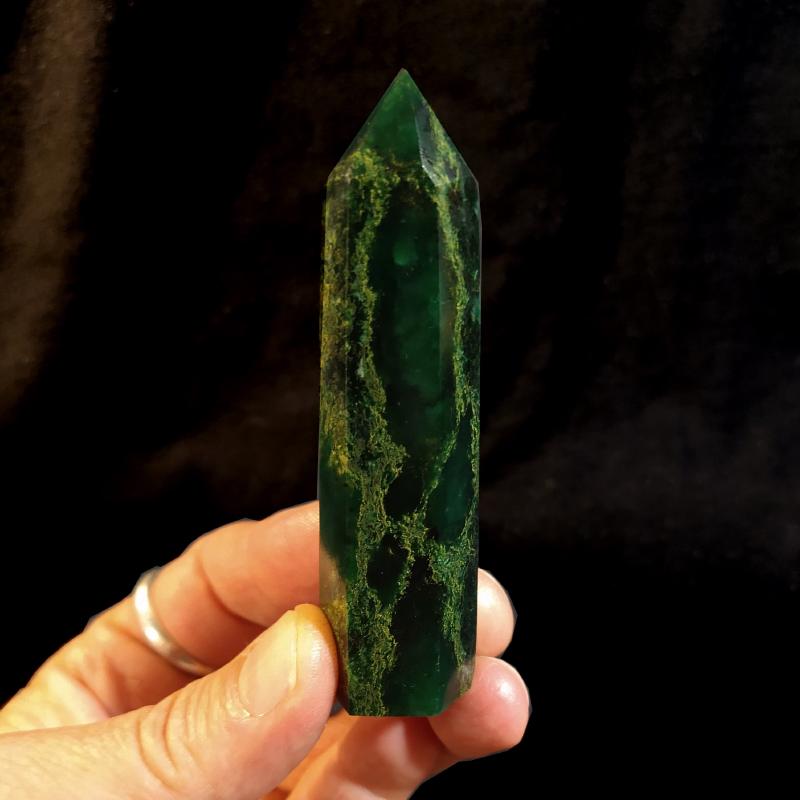 Moss Agate and Quartz Tower on stand, 12.85 inches long, 2.5 pounds in weight. See additional enlargements.Â