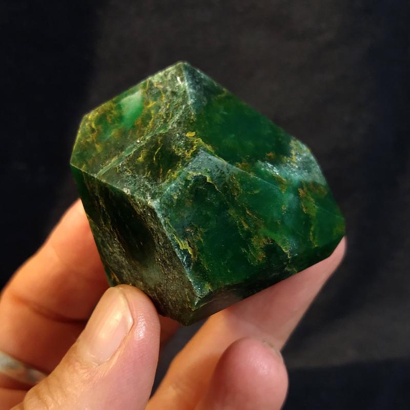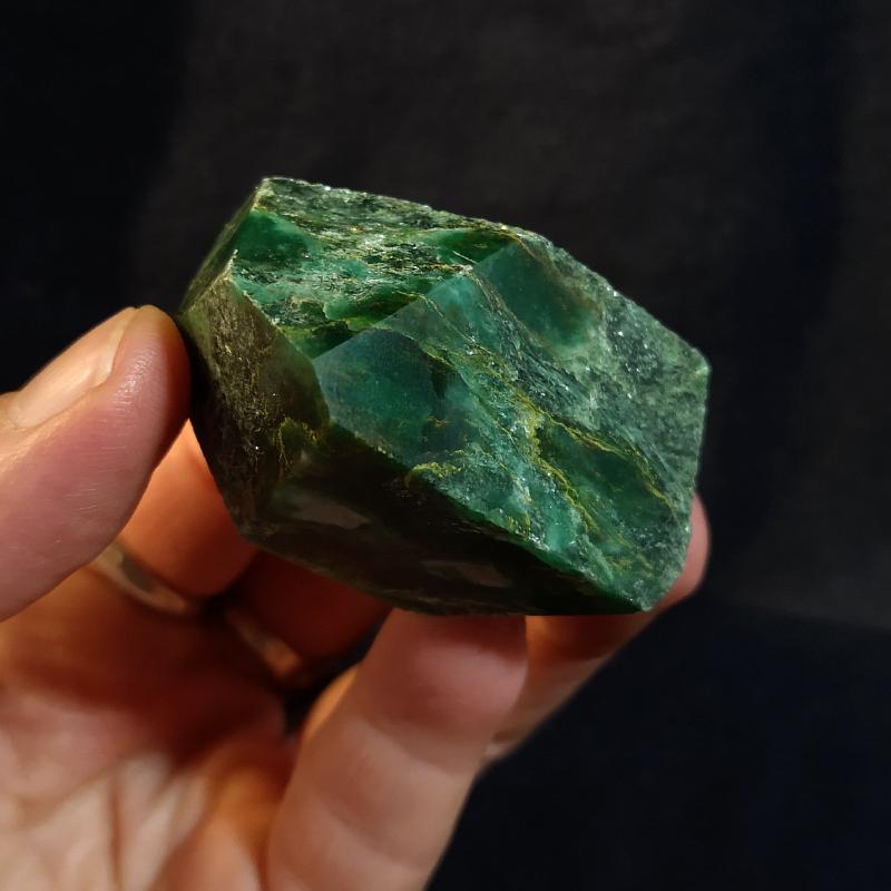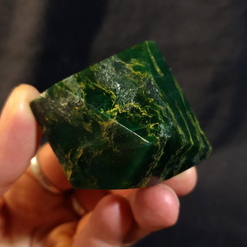Emerald Serpentine with Fuchsite, free-form facet cut. 1.65 inches long. This is a one-of-a-kind item. You will receive the actual item in photo. Once sold, it is gone.