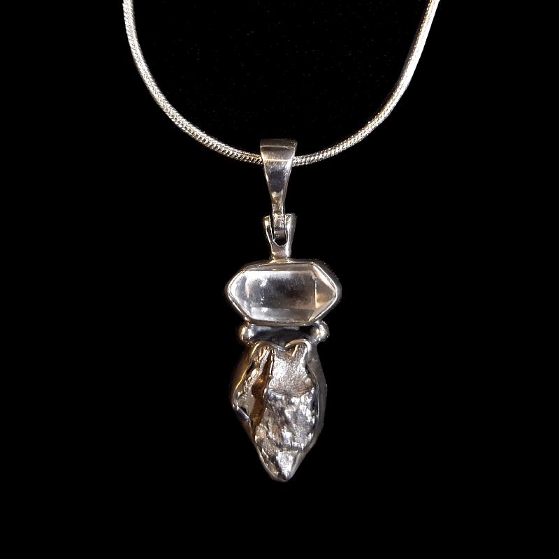 Small Campo del Cielo Meteorite & Moldavite Pendant, set in sterling silver. 18 inch silver plate courtesy chain included. 1.25 inches long including bail. This is a one-of-a-kind item - you will receive the actual item in photo. Once sold, it is gone.