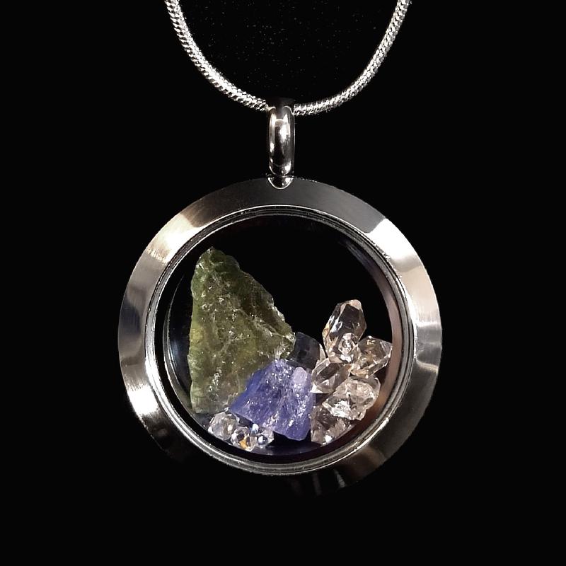 Moldavite / Tanzanite / Herkimer Diamond Pendant, set in stainless steel with glass "window." Pendant is 1 inch in diameter. 18 inch silver plated courtesy chain included. Each one unique.