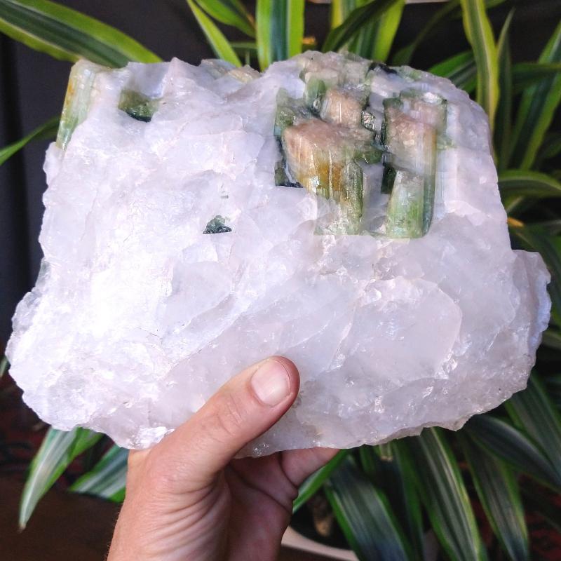 Tourmaline in White Quartz. Iron stand included. 8.25 inches wide, 5.59 pounds total weight including stand. This is a one-of-a-kind item - you will receive the actual item in photo. Once sold, it is gone.