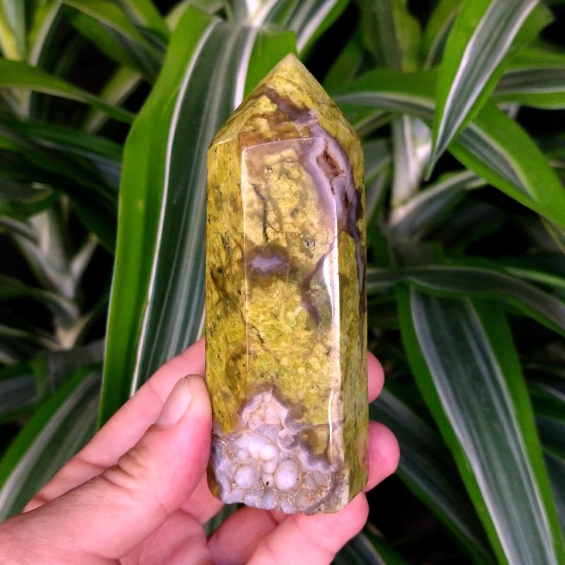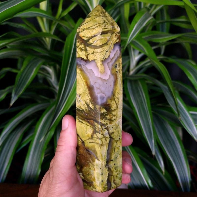 Moss Agate and Quartz Tower on stand, 12.85 inches long, 2.5 pounds in weight. See additional enlargements. This is a one-of-a-kind item - you will receive the actual item in photo. Once sold, it is gone.