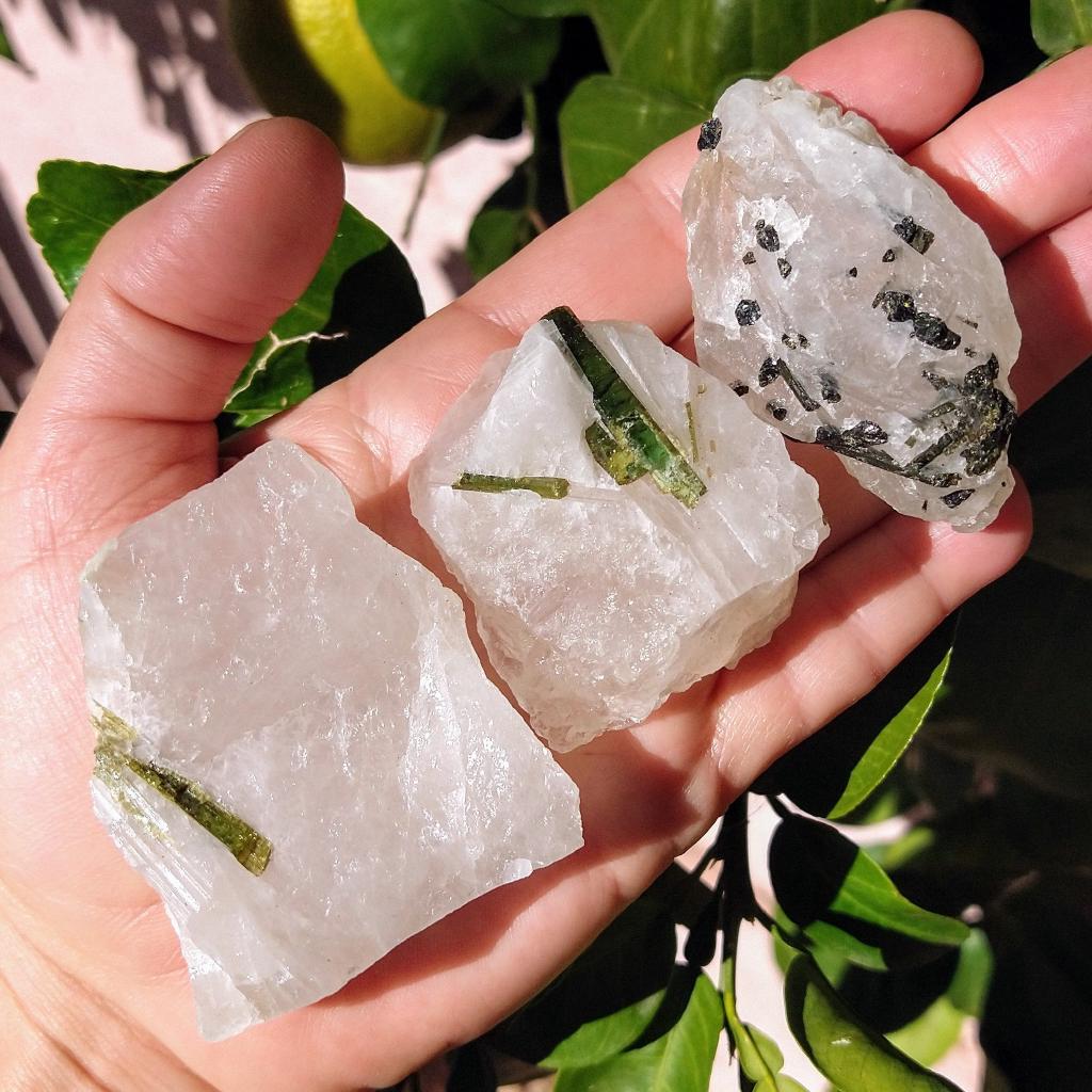 Green Tourmaline in Quartz. Approximately 1.75 - 2.25 inches long. Each one unique. Sold by the each.
