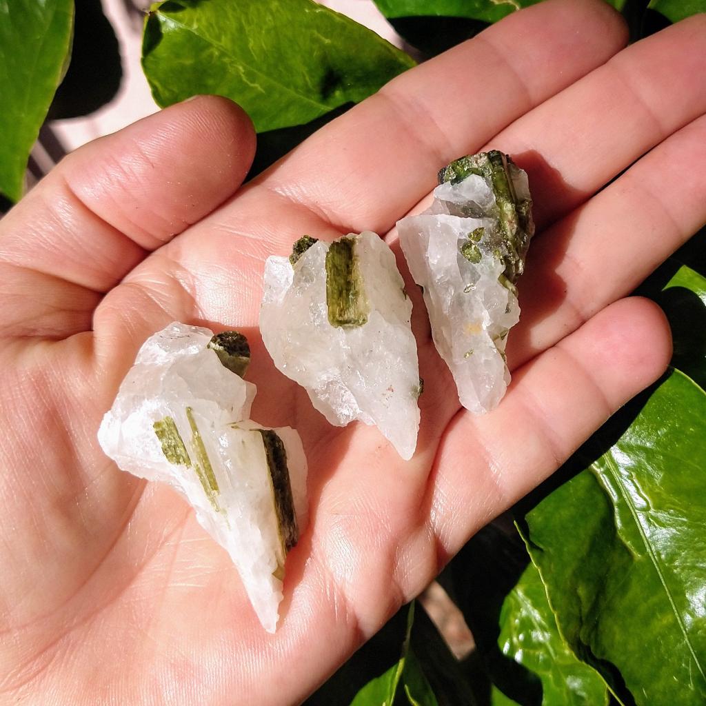 Mini Green Tourmaline in Quartz. Approximately 1.25 - 1.5 inches long. Each one unique. Sold by the each.