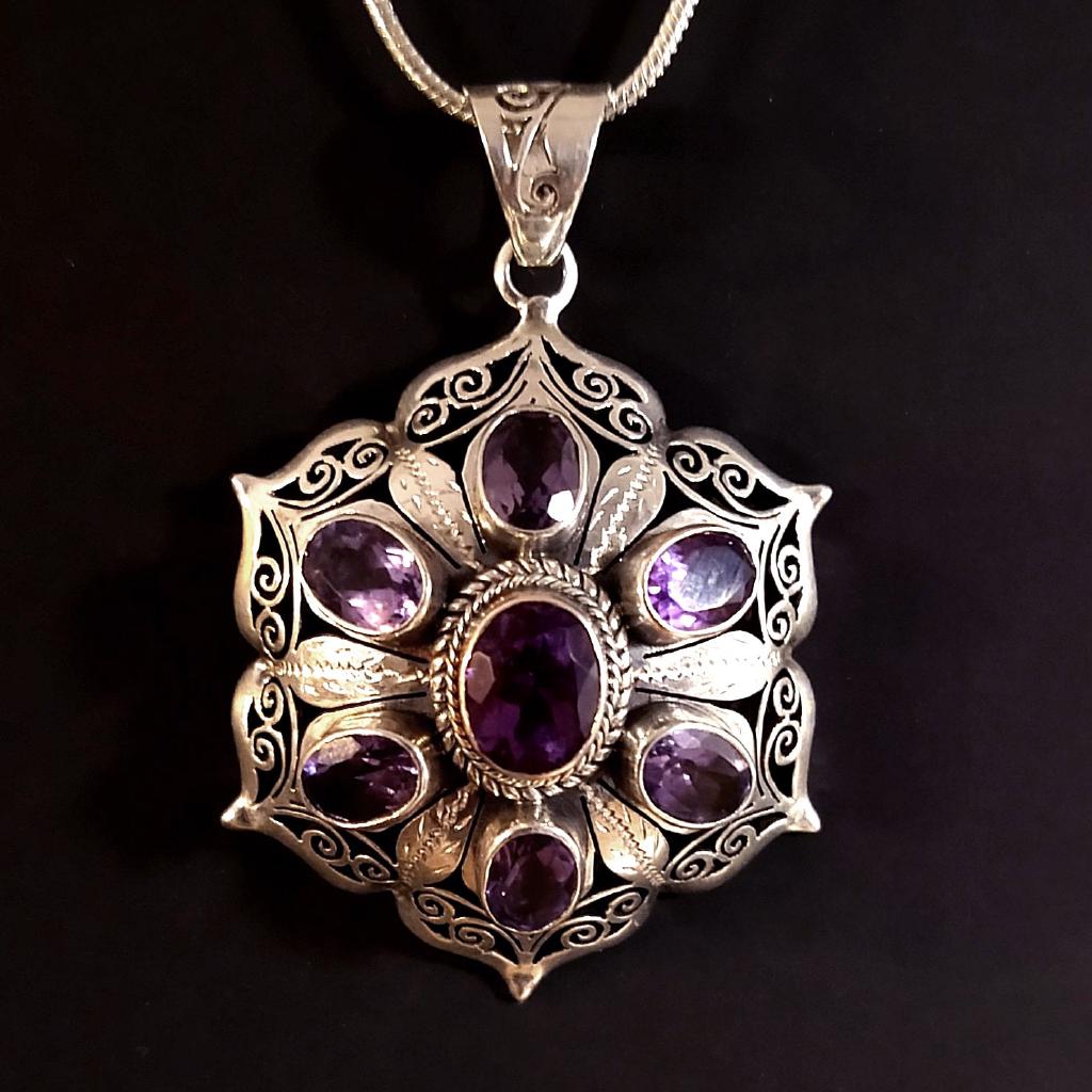 Amethyst Pendant, set in sterling silver. Made in Nepal by silversmith artist - exquisite. 1.85 inches long including bail. 18 inch silver plate courtesy chain included. This is a one-of-a-kind item - you will receive the actual item in photo. Once sold, it is gone.