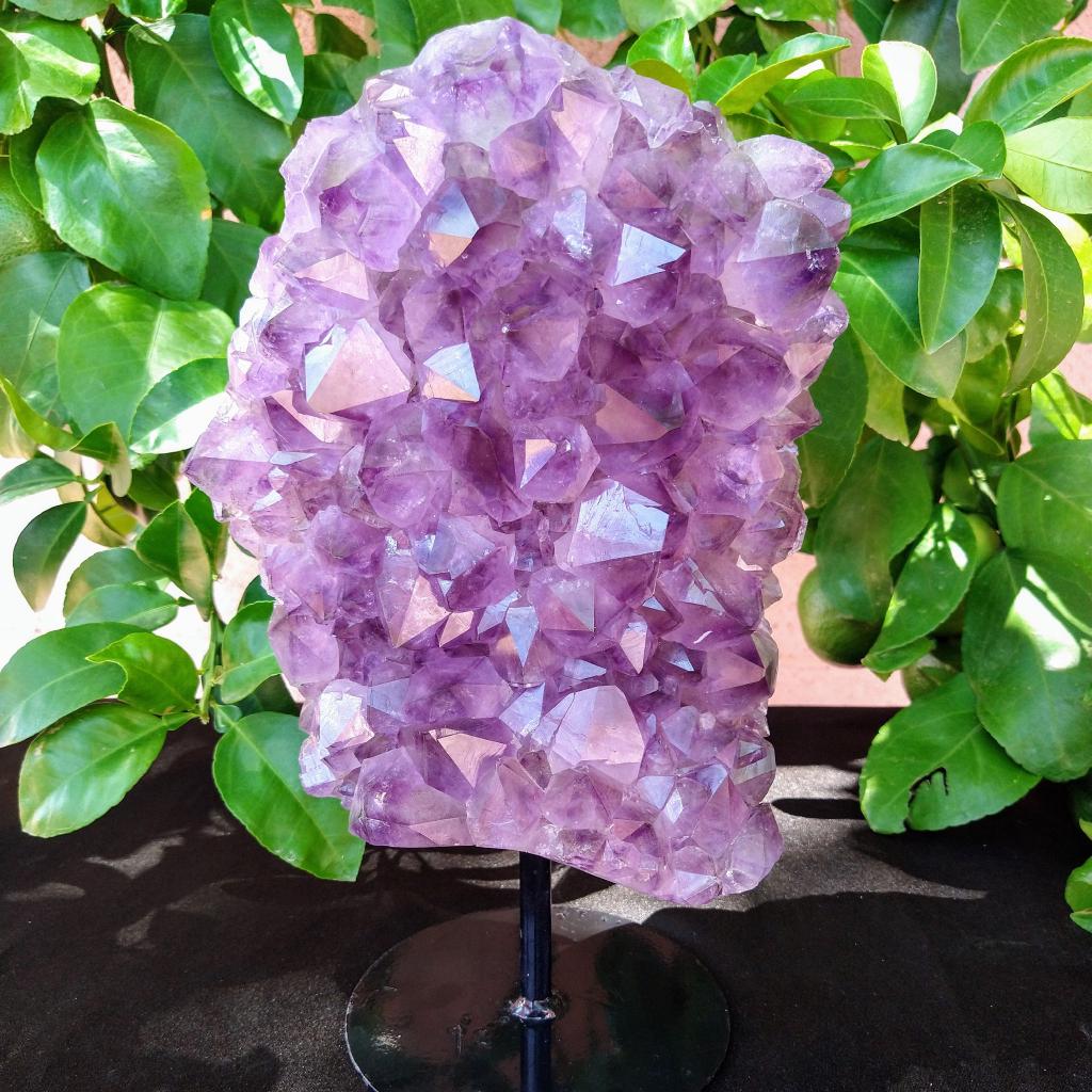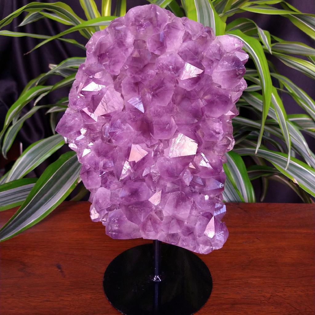 Amethyst specimen on stand. 11 inches tall total, 9.59 total pounds in weight.This is a one-of-a kind item - you will receive the actual item in photo - once sold, it is gone.